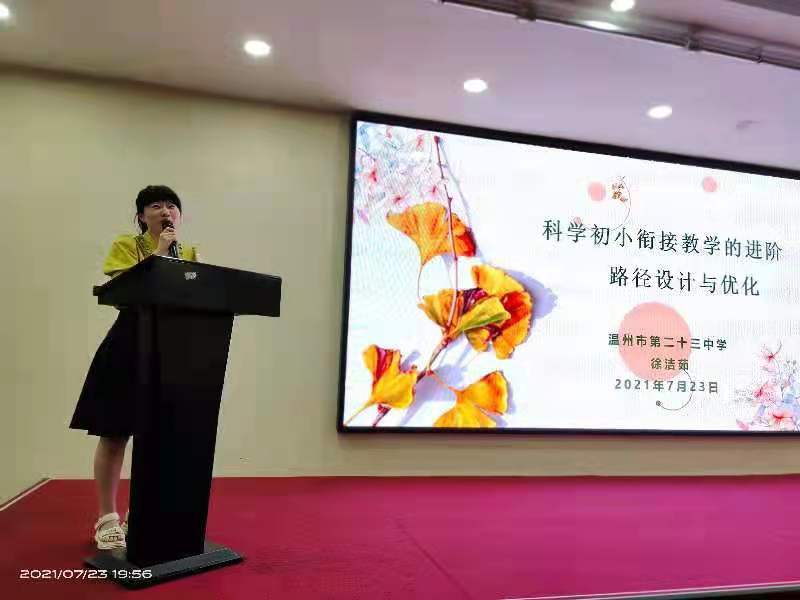 徐洁茹老师发言的主题是《科学初小衔接教学的进阶路径设计与优化》,包括如何在初小衔接教学中确定有效的学习期间,理清学习进阶的路径;如何在初小衔接教学中探测学生的已有学情,把握认知水平和短板;如何在初小衔接教学中利用学情研判的结果,优化初小衔接的设计。