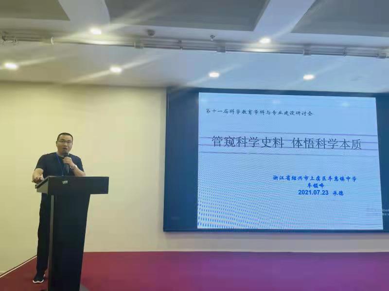 车镒峰老师发言的主题是《管窥科学史料 体悟科学本质》,他提出以史为料,创设情境,激发兴趣;以史为料,亲历过程,体悟本质;以史为料,体验情感,领悟精神,同时车老师也发表了自己对科学技术史教育的反思。