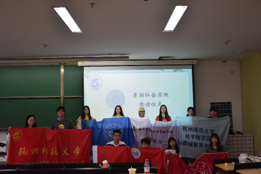 最后,仪式进行第四项议程,各社会实践队伍代表上台接旗。