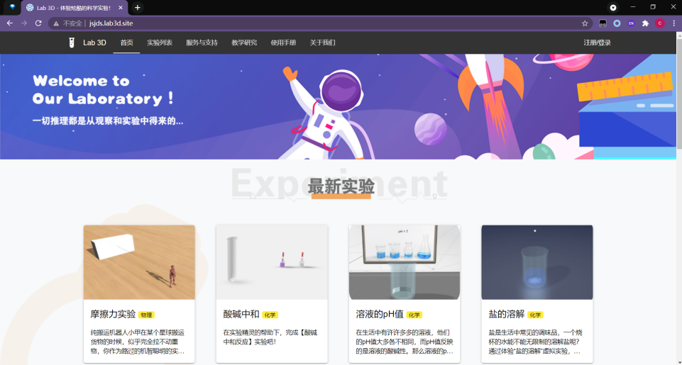 作品简介:本作品是一个面向探究式学习的Web3D中学科学实验平台,平台提供了丰富的学习资源与自由开放的虚拟实验环境,供学生进行探究式的实验学习。目前,平台已经上线了食盐的溶解、溶液的PH值、酸碱中和、摩擦力等多个虚拟实验。