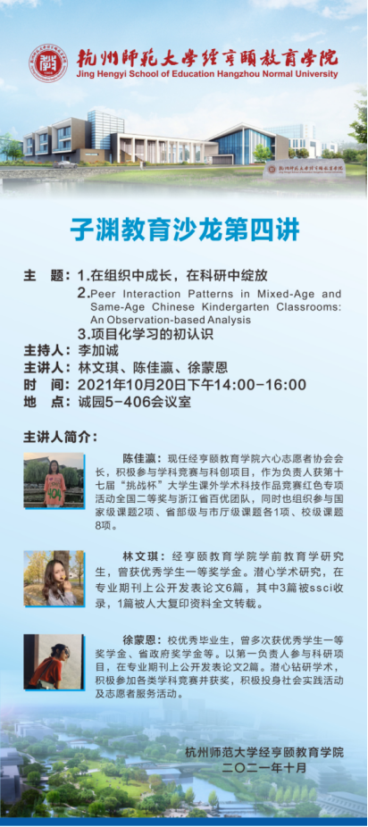 2021年10月20日,林文琪、徐蒙恩、陈佳瀛三位优秀学生代表作为主讲人做客子渊教育沙龙,与同学们进行了交流互动。