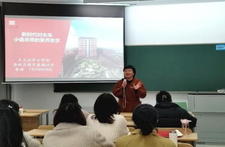 11月22日下午,浙江省春蚕奖获得者、杭州市优秀德育工作者、天元公学小学部校长俞珺应邀来天英足球即时比分 ,作“新时代对未来小语教师的素养要求”的专题讲座。天英足球即时比分 张惠苑老师主持讲座,2021级教育硕士小教语文方向的学生聆听了讲座。