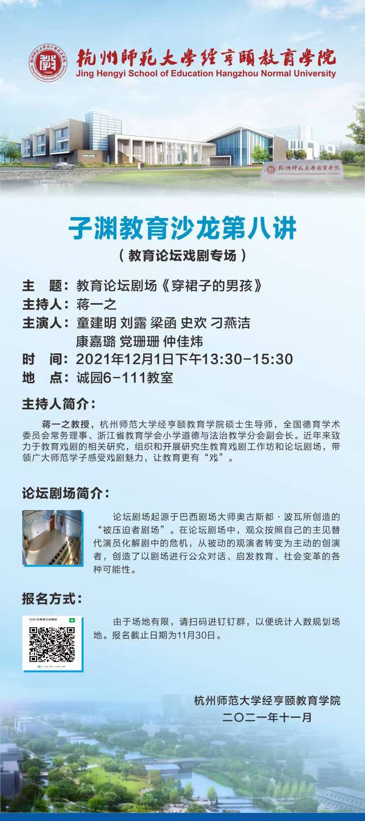 2021年12月01日,我学院第八期子渊教育沙龙在诚园6号楼111教室举行。本期教育沙龙为教育论坛戏剧专场,由蒋一之教授主持,主题围绕《穿裙子的男孩》,以论坛剧场的形式展开活动。本次专场主演人为童建明、刘露、梁函、史欢、刁燕洁、康嘉璐、党珊珊、仲佳炜这八位同学。