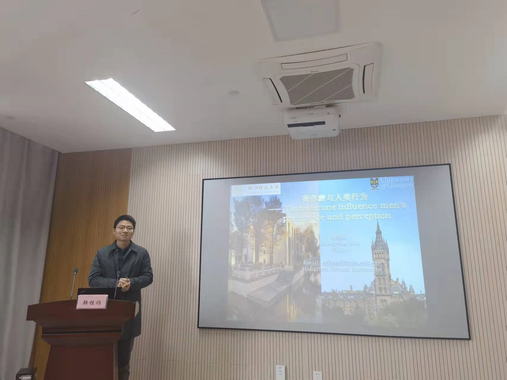 第三位主讲人是韩柽炀副教授,他主讲的题目是荷尔蒙与人类行为——Testosterone influence men's preference and perception。他从进化心理学的角度向大家解释了人类择偶审美的生物学基础,以及睾酮影响男性择偶审美与同性嗓音感知等内容。在问答环节,多名教师与韩柽炀博士展开了激烈的讨论。