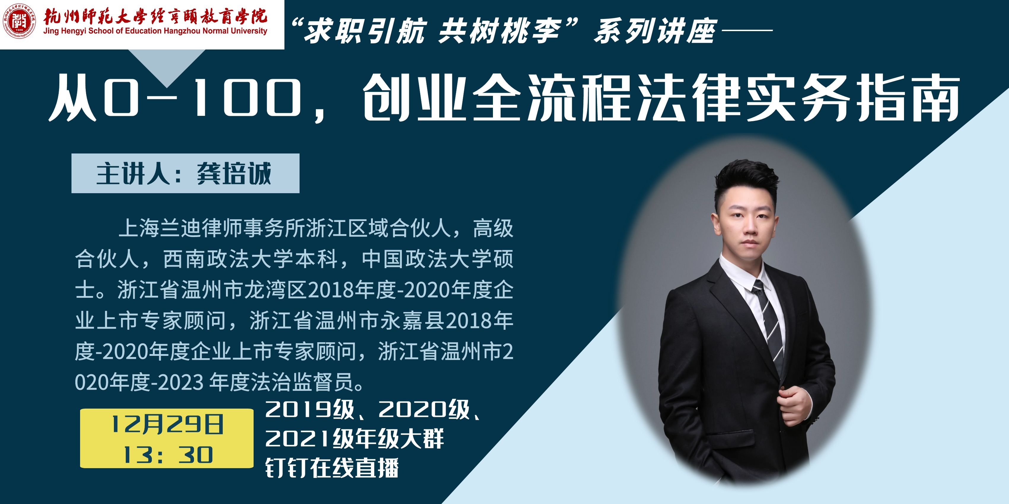 同学们的创业热情,学院特地邀请了上海兰迪律师事务所浙江区域合伙人,高级合伙人龚培诚老师在线上为全院同学们带来了名为“从0-100,创业全流程法律实务指南”的讲座。
