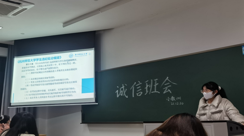 小教215班则是从三个方面开展了班会,分别是班主任发言、期末考动员、诚信考试教育。明诚信之理,立做人之本,班长通过诚信小故事来强调诚信的重要性,并与同学们一起仔细解读学生手册中考试的相关规定。最后,同学们集体签订班级诚信考试承诺书。