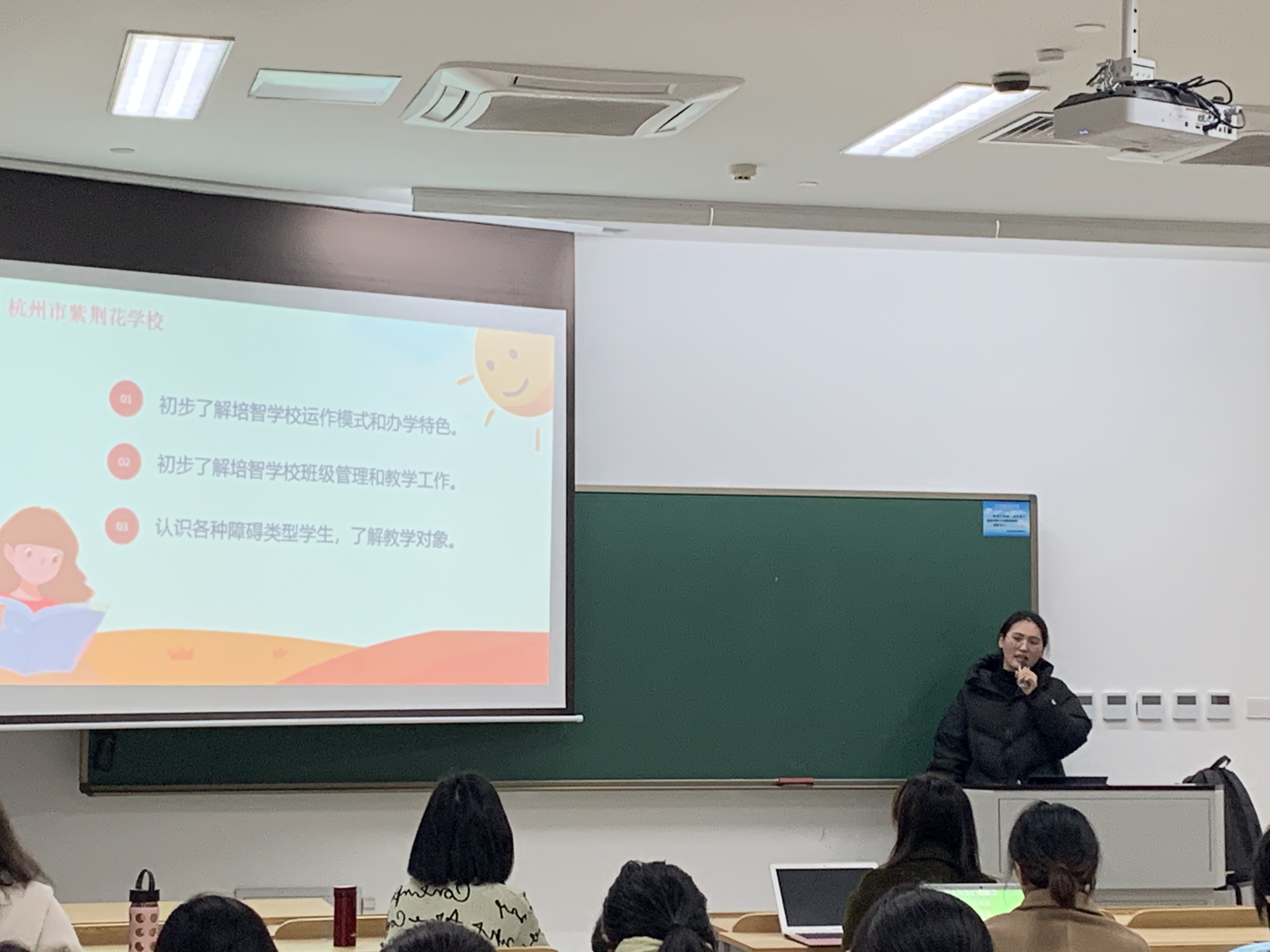接着,张欣老师作为特殊教育专业优秀毕业生代表向同学们分享了自己的见实习经历及作为一名青年教师的成长历程。结合自己的经验,综合杭州市紫荆花学校老师对见习实习生的殷切期望,张欣老师认为见实习最重要的是态度,希望同学们在见实习过程中能够做到积极主动、礼貌尊重、虚心好学、吃苦耐劳、勤于反思,鼓励同学们能够抓住见习实习的机会熟悉特殊教育学校各项工作,早日适应特殊教育教师的角色。