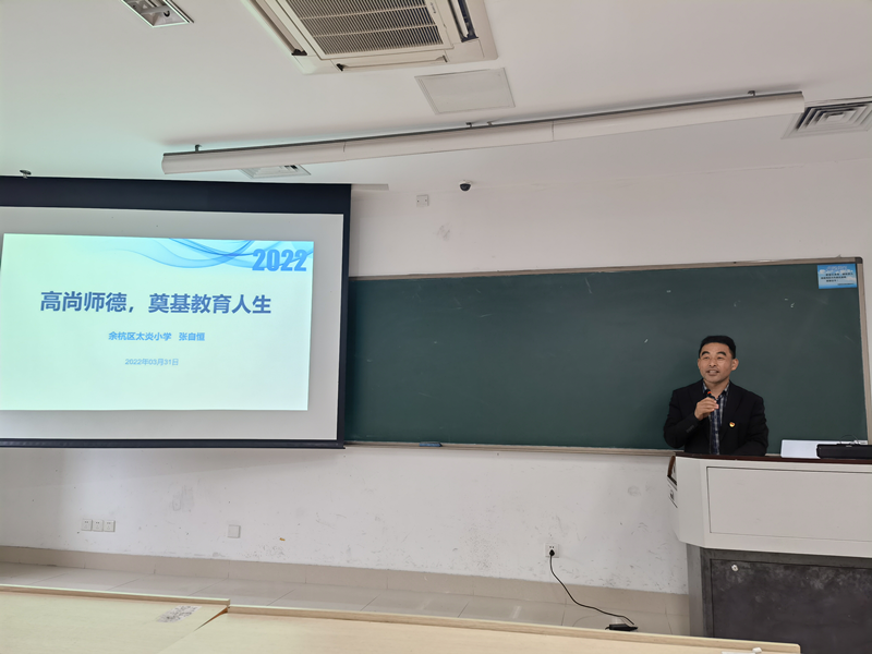 《德育与班级管理》是天英足球即时比分 开设的一门面向小学教育硕士的双师课程,旨在提高小学教育专业教育硕士培养质量。2022年3月31日星期四下午,在恕园33号楼205教室,来自余杭区太炎小学的副校长张自恒老师为小学教育专业硕士研究生带来《高尚师德,奠基教育人生》的精彩讲座。