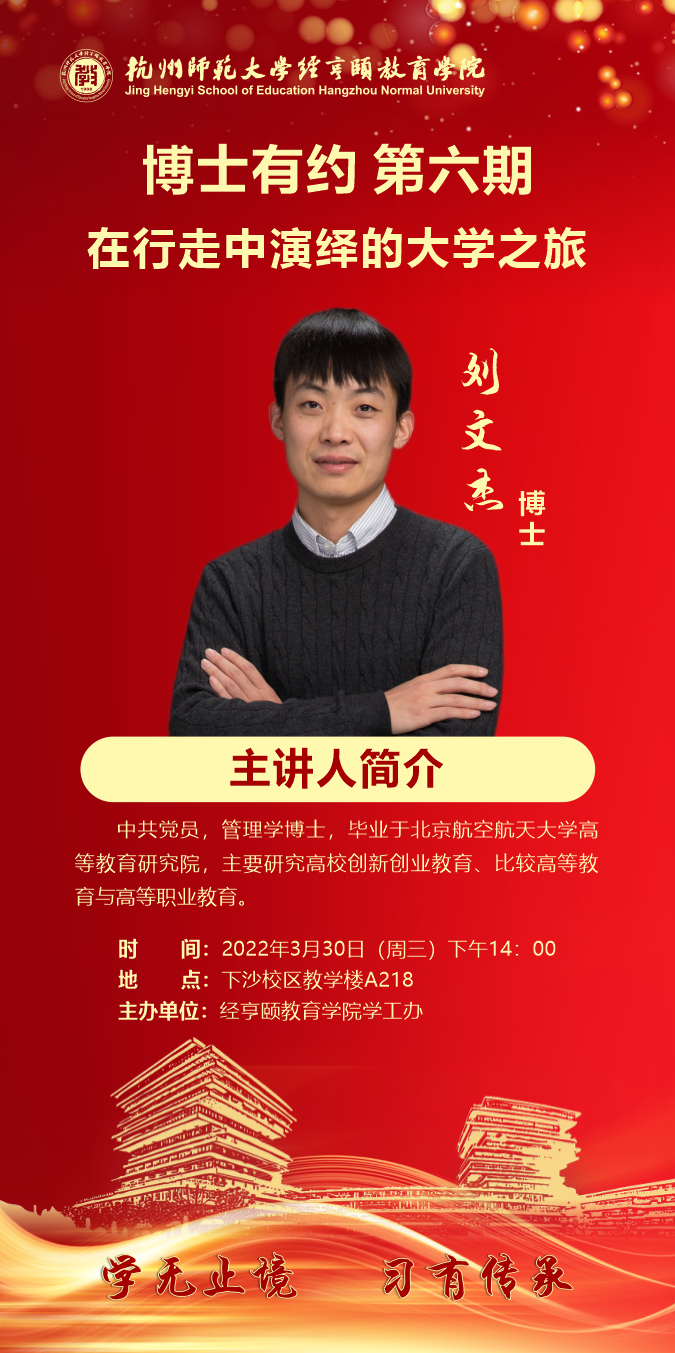 3月30日下午,天英足球即时比分 博士有约系列讲座第六期在下沙校区教学楼A218顺利开展。本期讲座的主题为在行走中演绎的大学之旅,主讲人为天英足球即时比分 刘文杰老师。