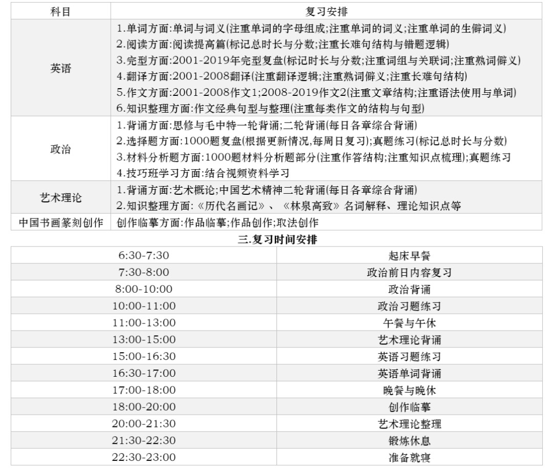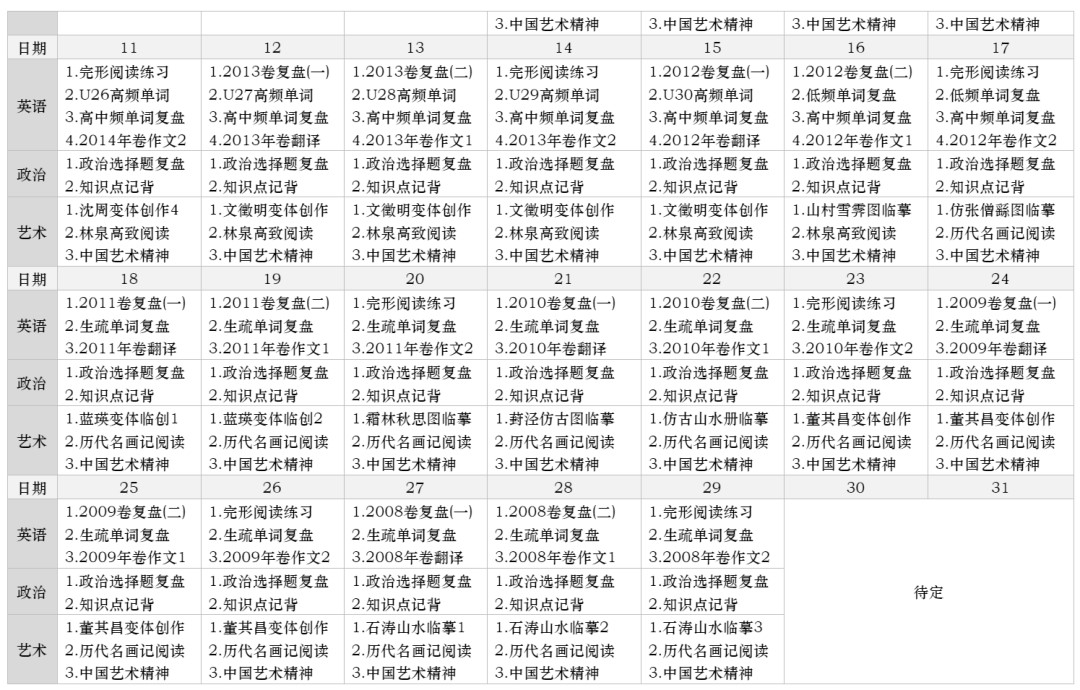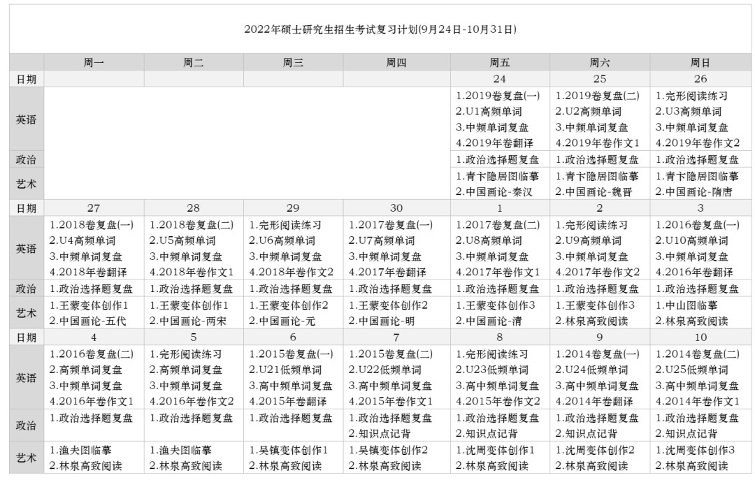 从学前教育跨考至美术专业,对个人的专业知识储备和应试心态都是极大的考验。考研美术方向不仅需要高超的绘画技能,更需要广博的专业理论知识支撑。相比于已经接受过本科四年理论学习的专业考生,许陈炜需要付出比他们多几倍的努力。密密麻麻的计划表、精确到每天的学习任务,记录着他一路走来的汗水与坚持。