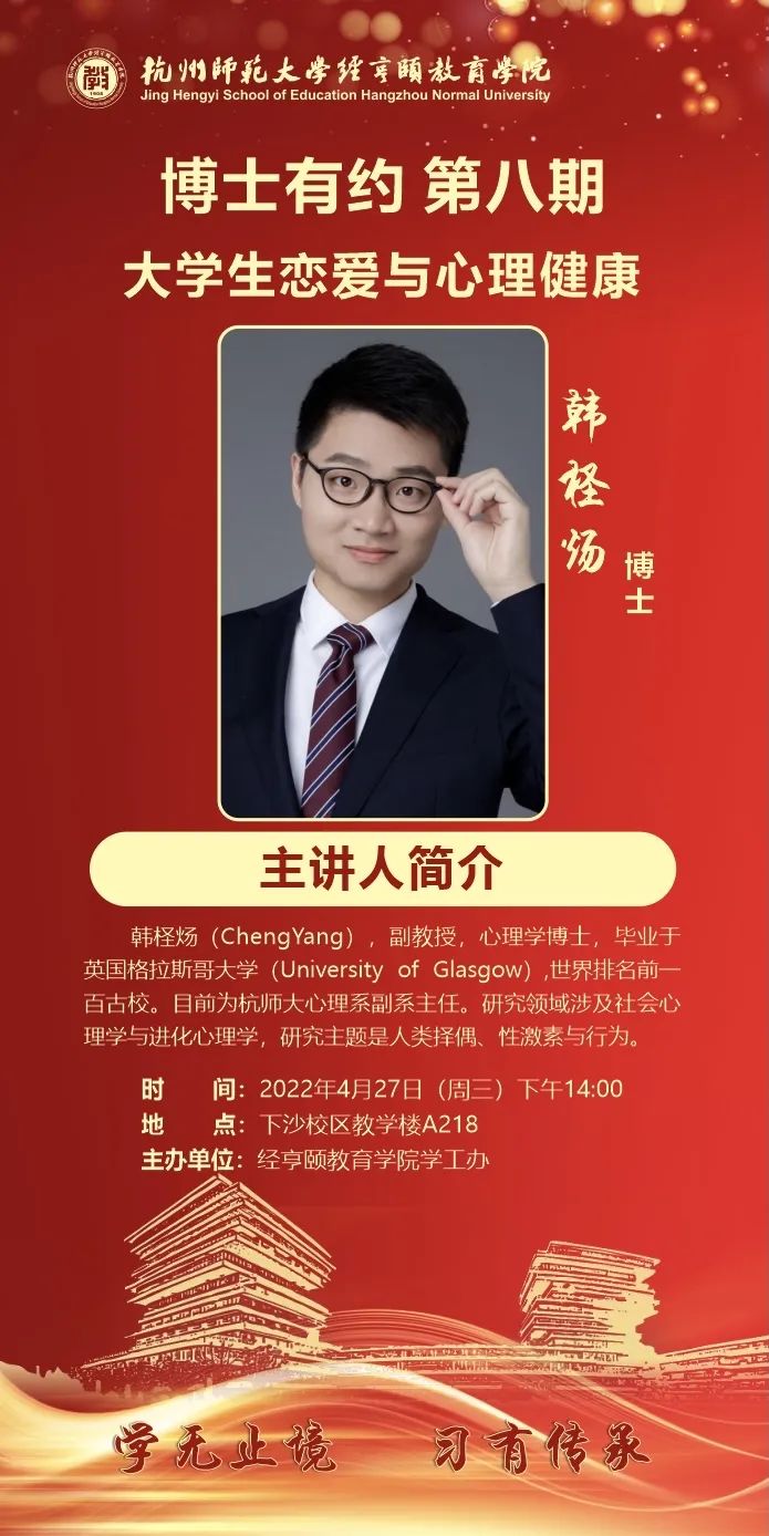 4月27日下午,天英足球即时比分 博士有约系列讲座第八期在下沙校区教学楼A218举行。本次讲座主题为大学生恋爱与心理健康,主讲人为韩柽炀老师。