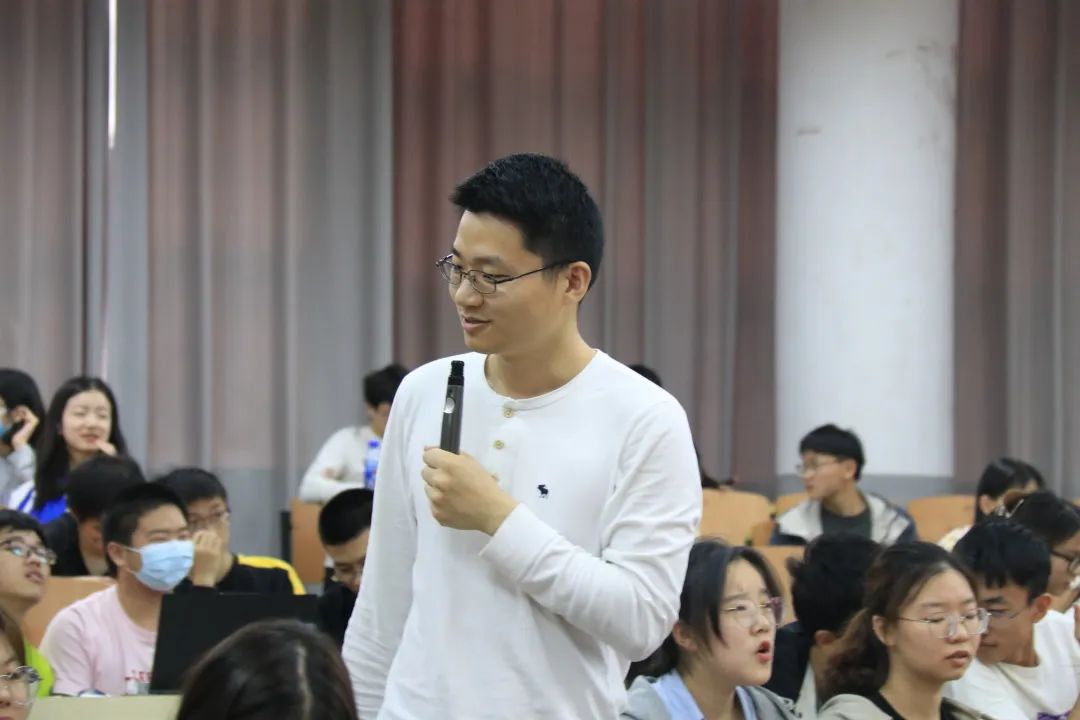 讲座正式开始之前,韩柽炀老师按照座位先把同学们分成了数个小组,甚至鼓励同学们坐到暗恋的同学旁边去。在“恋爱”模块的讲解中,他首先向同学们提问:什么是爱情?针对这个问题,韩老师依据斯滕伯格的爱情三要素理论,从心理学的角度诠释了爱情的定义。之后,他运用了埃里克森的心理社会发展理论解释了大学生谈恋爱的意义。