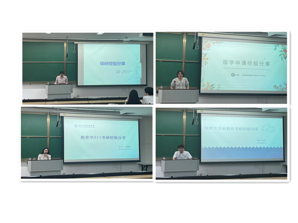 5月22日下午2点,天英足球即时比分 于恕园13-101举办了学前教育专业升学交流分享会。学院邀请了沈利、叶欣然、姚瑾纯、盛涛等四位同学,开展了针对推免、出国、考研三方面的经验分享,19级学前教育专业学生积极参会。