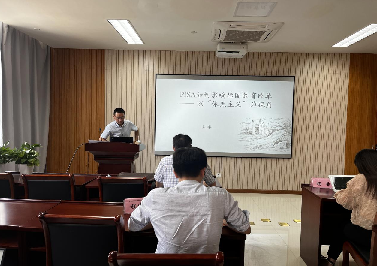 沙龙第二位主讲人是肖军博士,肖老师主讲的题目是“PISA如何影响德国教育改革——以‘休克主义’为视角”。经济合作与发展组织以PISA作为其参与全球教育治理的重要工具,德国2000年的PISA测试结果震惊了德国公众,也拉开了德国教育系统改革的大幕。肖老师以“休克主义”为视角,剖析OECD如何以PISA测试为工具,在全球推行其新自由经济的教育理念,进而影响到主权国家的教育改革。其研究分为三个部分,第一部分主要是对“休克主义”这一研究视角和PISA在主权国家的运用实践进行了介绍。第二部分肖老师详细概述了PISA测试后的德国教育改革,主要内容包括建立教育标准和评估机制、改革中等学校结构和学制、新建和扩建全日制学校、强化幼儿园小学衔接以及加大对有移民背景学生的教育等方面。第三部分,肖老师基于休克主义的视角分析了PISA作为OECD的教育比较工具促进主权国家教育改革的程序,即带有动机的主体(“PISA震惊”背后的OECD)→创造休克危机(创造教育改革的“白板”)→快速推出改革措施(极端改革措施的大面积推进)。在场的师生对该研究进行了热烈的讨论。