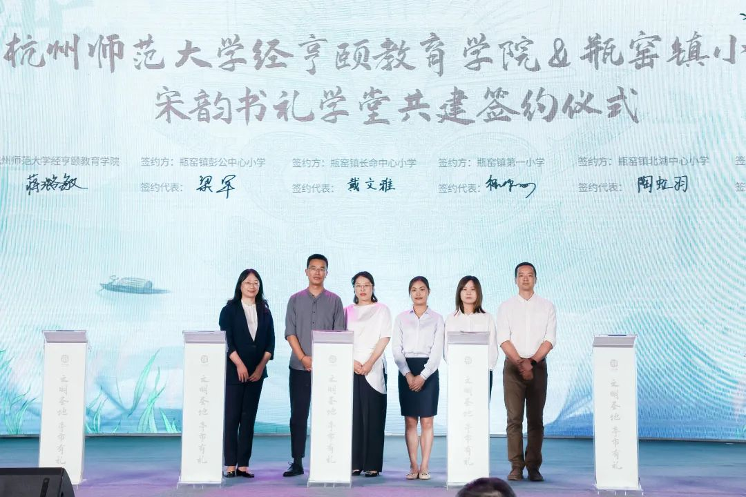 党委书记蒋璐敏、党委副书记沈嫣出席瓶窑镇“文明圣地·亭市有礼”文明实践品牌发布暨“宋韵知书礼”启动仪式,并代表学院与瓶窑镇五所小学签订“宋韵书礼学堂”共建协议。