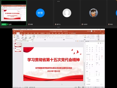 省第十五次党代会全面吹响“在高质量发展中奋力推进中国特色社会主义共同富裕先行和省域现代化先行”的冲锋号。为进一步学习好、领悟好省第十五次党代会精神,结合学院党委关于认真学习宣传贯彻党代会精神的有关要求,7月22日晚,天英足球即时比分 研究生第五党支部于线上开展主题党日活动,支部党员集体学习研讨,并分享个人心得体会,进一步推动省党代会精神入脑入心、落地生根。