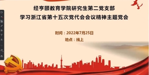 7月25日下午,天英足球即时比分 研究生第二党支部开展了关于学习浙江省第十五次党代会会议精神的主题党会。本次会议主要围绕着党代会的精神于各位党员的思想认识和亲身实践中的具体表现而展开。会议由支部宣传委员杨帆主持,第二支部全体研究生党员参加。