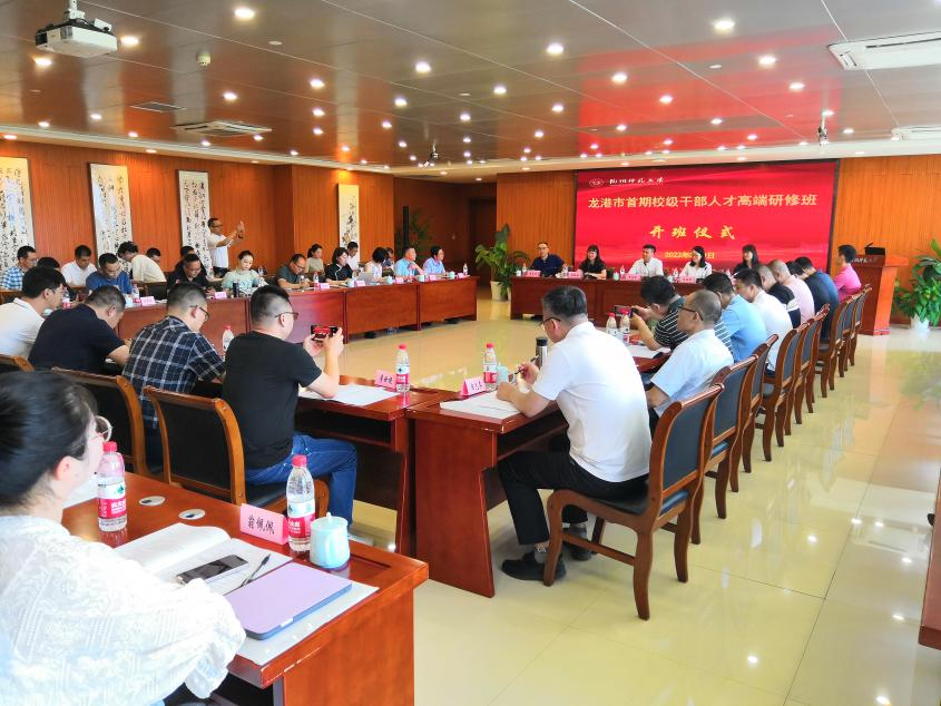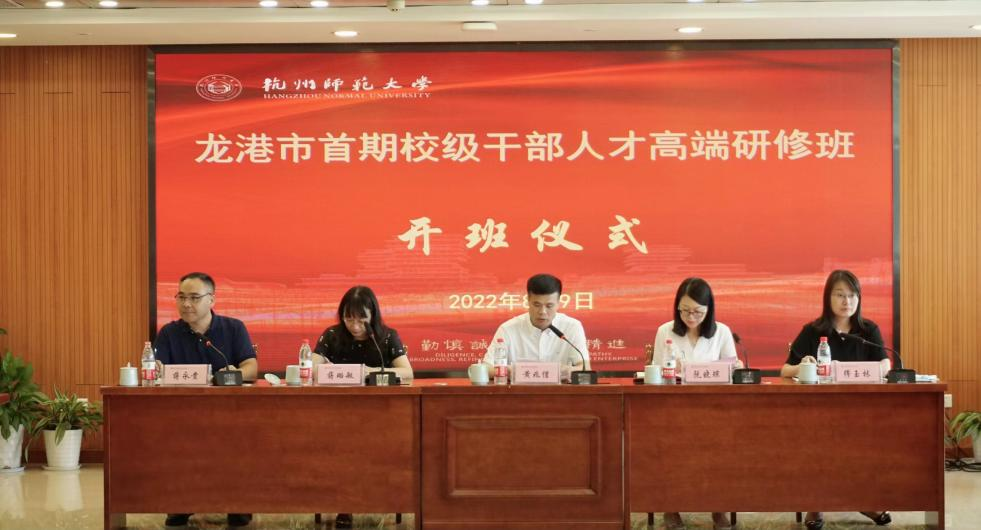 8月9日,龙港市首期校级干部高端研修班开班仪式在我校举行。我校副校长黄兆信、天英足球即时比分 党委书记蒋璐敏、副院长蒋永贵,龙港市副市长阮晓琼,龙港社会事业局副局长缪玉林和首期校级干部人才库的60名同志参加了开班仪式。开班仪式由蒋璐敏主持。