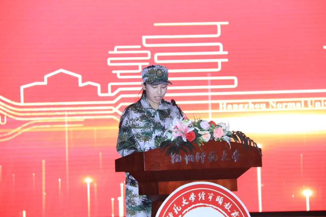 小教213班的朱奕婷同学代表全体参训学员向各位领导、教官、老师致以崇高的敬意和衷心的感谢,并表示在接下来的训练中,会以军人的标准来严格要求自己,服从命令,听从指挥,努力培养吃苦耐劳的意志品格;端正态度,刻苦训练,发扬团结互助的优良作风,在竞争中讲团结讲合作;发扬“勤慎诚恕,博雅精进”的校训精神,展示师大未来的青春风采。