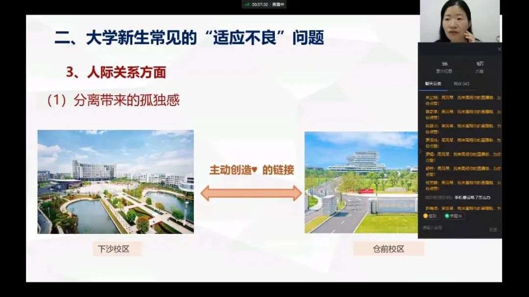 步入正题,周老师列举了新生在生活、学习、人际关系三方面的常见问题。在生活方面,全新的生活环境和集体生活模式是新生不能适应大学生活的主要原因,周老师希望同学们能够保持积极心态,在不断磨合中找到自己的生活节奏。