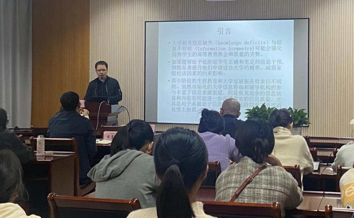 沙龙第二位主讲人是汪卫平博士。汪老师主讲的题目是“大学信息的来源、水平及影响因素——基于华东地区县中高三学生的实地考察”。研究分为三个部分:第一部分,汪老师从“相较于传统的升学考试中劣势阶层信息不足,当代大学多元录取机制似乎进一步加剧了阶层高等教育分化”“新高考改革强化了学生及家庭的选择权,但学生选择权的扩大并没有伴随其准备能力的提升”“大学相关信息缺失(knowledge deficits)与信息不对称 (Information Asymmetry)可能会强化弱势学生的高等教育机会和质量的劣势”等方面阐述了此研究的背景。对“大学信息的概念、维度及应用”进行了文献综述,呈现了此研究的数据来源于“研究者及团队于2018-2022年在中国东部不同地区的高中、农村、高校所进行的接力与纵向的系统性考察”。再次第二分部分,汪老师围绕“大学学习生活信息来源渠道”“学生招录政策、奖助学金信息来源渠道”“不同收入家庭学生大学信息来源差异”“学生对不同维度特质信息重要性的评价”“不同收入家庭对特质性重要性的评价”“学生对不同大学信息掌握程度”“不同收入家庭学生信息掌握程度”“大学信息掌握水平的影响因素分析”等问题呈现了研究发现。第三部分,总结了研究结论、讨论和政策建议。大学信息来源的主要渠道是社交新闻媒体和老师同学、亲朋好友。低收入家庭更依赖以学校官方网站或资料与社交新闻媒体为代表的弱关系。高收入家庭更依赖老师和同学、父母教育、亲朋好友等强关系。学生大学选择看重专业、就业、教师水平等激励信息,他们对招录过程的特殊招生政策、奖助学金等信息知晓水平较差,其中弱势群体的劣势更为明显。班级排名、学业努力、父母参与是影响低收入家庭学生信息水平的主要因素,而独生子女、父母教育水平、信息来源类型影响高收入家庭学生信息水平。