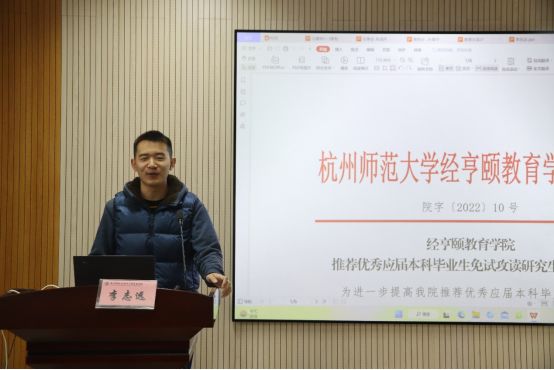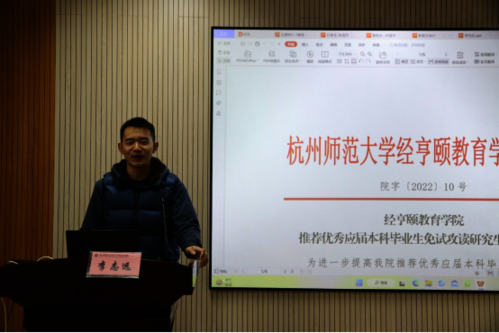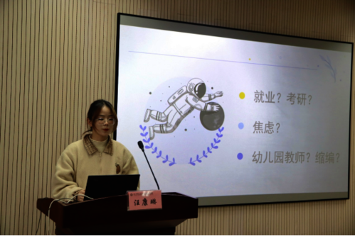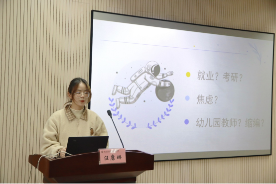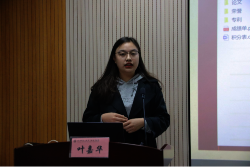 汪康琳同学主要介绍了“2+3推免”政策。她首先从自身心态与未来规划两个方面,对自己进行了自我分析。紧接着,结合相关推免文件,将“2+3推免”与普通推免做了对比。最后,她再次强调了优秀的学习成绩和及时准确掌握信息的重要性,勉励同学们一定根据自身特点,及早确定方向,走适合自己的路。
