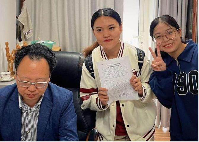王天爱、周甜和指导老师骆宏拍摄视频并合影