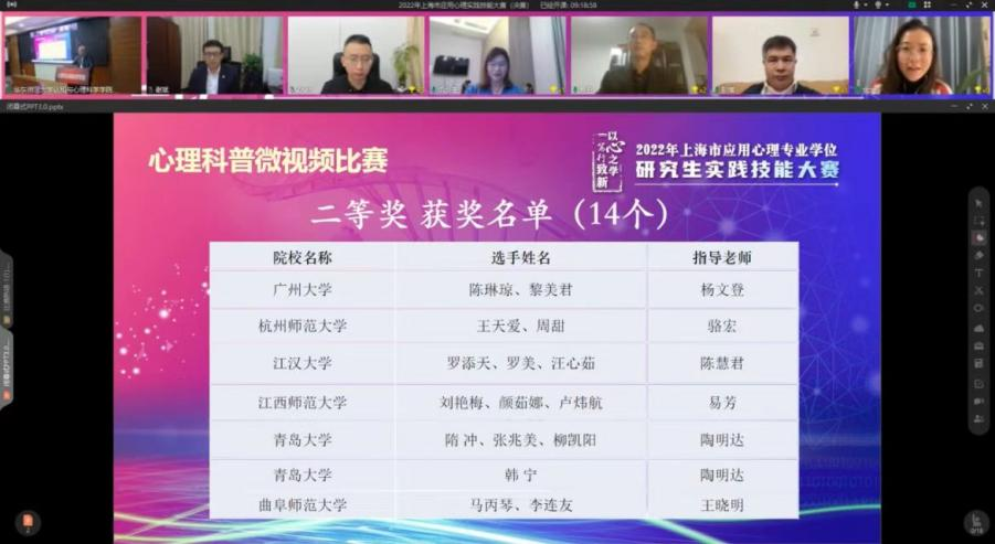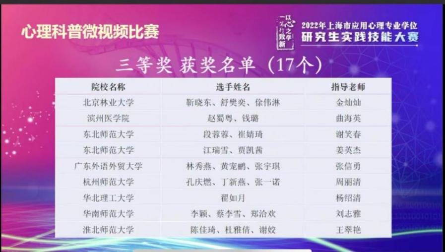 2022年11月27日,应用心理专业硕士的王天爱、周甜、孔庆燃、丁新燕、张一诺五位同学在“上海市应用心理专业学位研究生实践技能大赛”中取得优异成绩,其中王天爱、周甜组成的团队获得了心理科普微视频比赛二等奖(指导教师骆宏),孔庆燃、丁新燕、张一诺组成的团队获得了心理科普微视频比赛三等奖(指导教师周丽清),骆宏老师获评优秀指导教师奖。