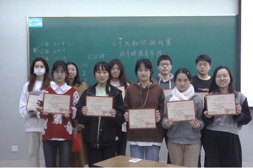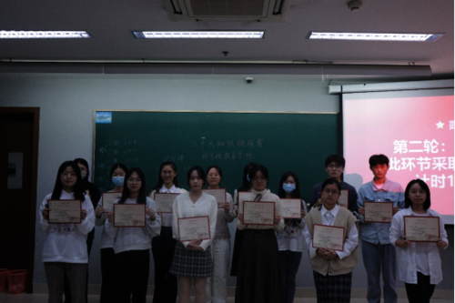 第一轮比赛以组队PK的形式进行,在脑速与手速的交锋中,本次活动被推上了高潮。有的小组开局就连对多题,赢得观战同学和本组队员的连连喝彩,显示出对党的历史与国家时事的熟悉度和敏感度;而有的小组虽然手速略逊于人,但正确率很高,表明他们认真地学习了党的二十大精神和党的历史,对这些内容有十分精准的把握。在这个过程中,不仅参赛选手们进行激烈的比拼,场下的观众也被选手们带动,十分积极,按捺不住对知识的热情,教室里不断传出喝彩声和为错失正确答案的选手而感到惋惜的感叹,教室里比赛氛围十分浓厚!最终,通过组内同学团结合作,四支队伍凭借牢固的知识基础和敏捷的手速进入第二轮!