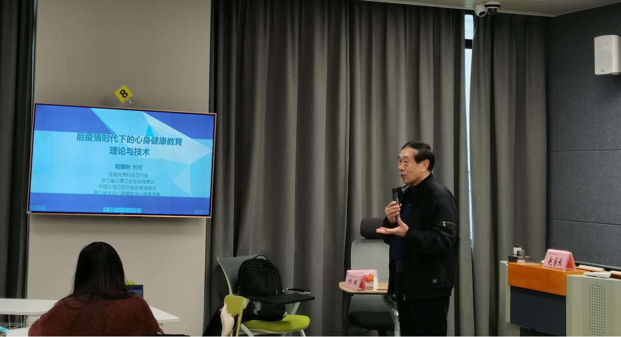 2022年12月7日下午,中国心理卫生协会全国理事会名誉理事长,浙江省心理卫生协会理事长,浙江省大众心理援助中心首席专家赵国秋做客学院太炎教育讲堂,为天英足球即时比分 师生作题为“后疫情时代下的心身健康教育理论与技术”讲座。天英足球即时比分 师生70余人参加,讲座由赵立和杨群教授主持。