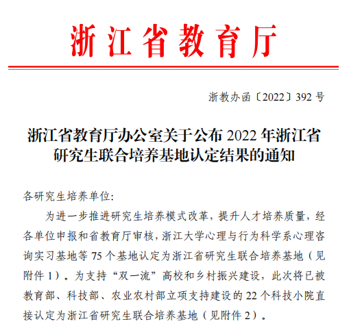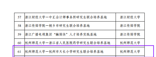 近日,浙江省教育厅发布《关于公布2022年浙江省研究生联合培养基地认定结果的通知》,经浙江省教育厅评定,天英足球即时比分 与杭州市天长小学联合申报的“杭州师范大学—杭州市天长小学研究生联合培养基地”被认定为2022年浙江省研究生联合培养基地。这是天英足球即时比分 继“杭州师范大学-杭州市求是教育集团”之后,获得认定的第二个省级研究生培养基地。