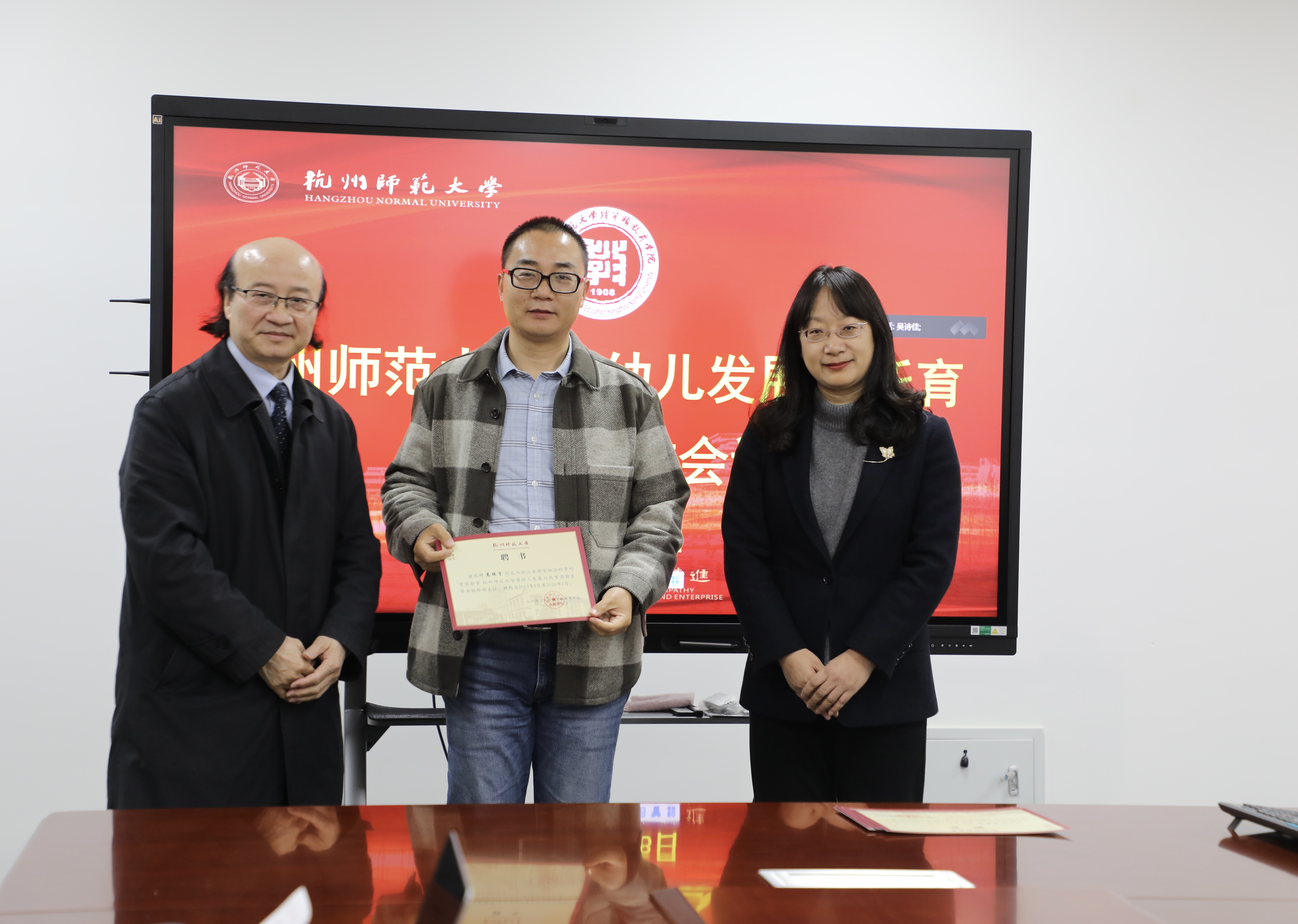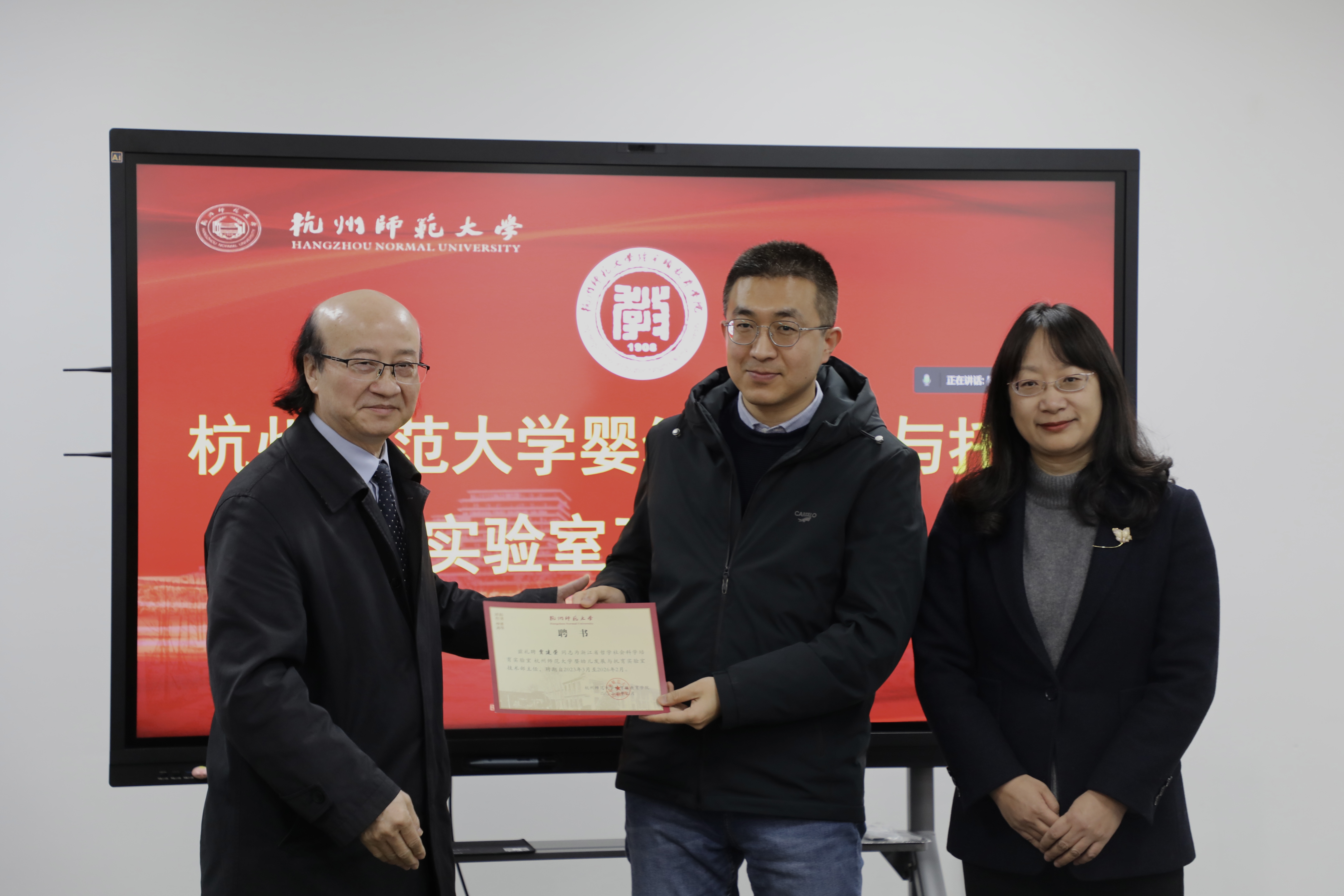 赵立老师首先宣读了浙江省哲学社会科学培育实验室批准文件,并介绍了实验室成立背景及机构设置情况。首席专家李葆明和方晓义分别致辞。李葆明老师简要回顾了实验室的前期申报工作,并对未来实验室发展进行了规划和展望。方晓义老师表达了对实验室获得省级科研平台表示祝贺,并提出了婴幼儿发展中的一些研究热点问题,引发老师们的共鸣和讨论。聘任仪式最后环节由蒋璐敏书记和李葆明老师共同为实验室综合部、实验技术部、学术联络部等部门主任和副主任颁发聘书,并合影留念。