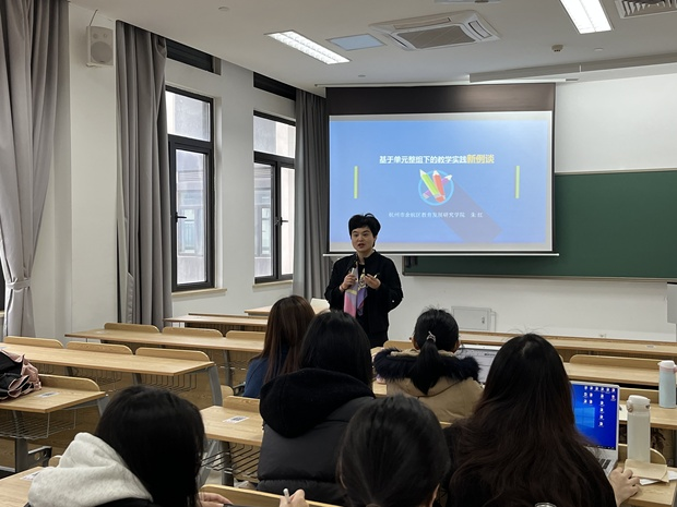 3月31日上午,杭州市余杭区教育发展研究学院的教研员朱红老师应邀来天英足球即时比分 作“基于单元整组下的教学实践新例谈”专题讲座。李菁老师主持讲座,2022级教育硕士小学教育专业的学生聆听本次讲座。