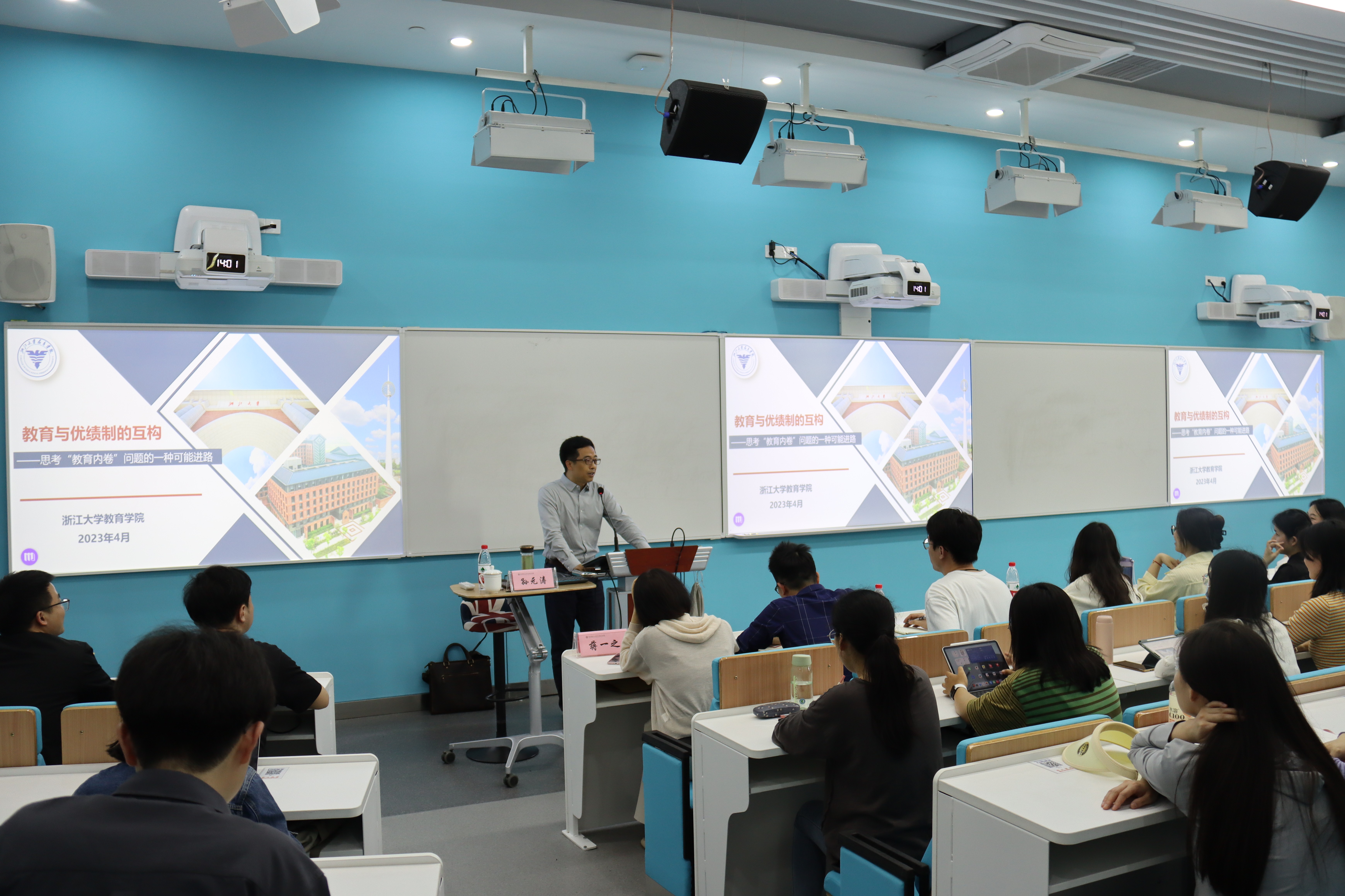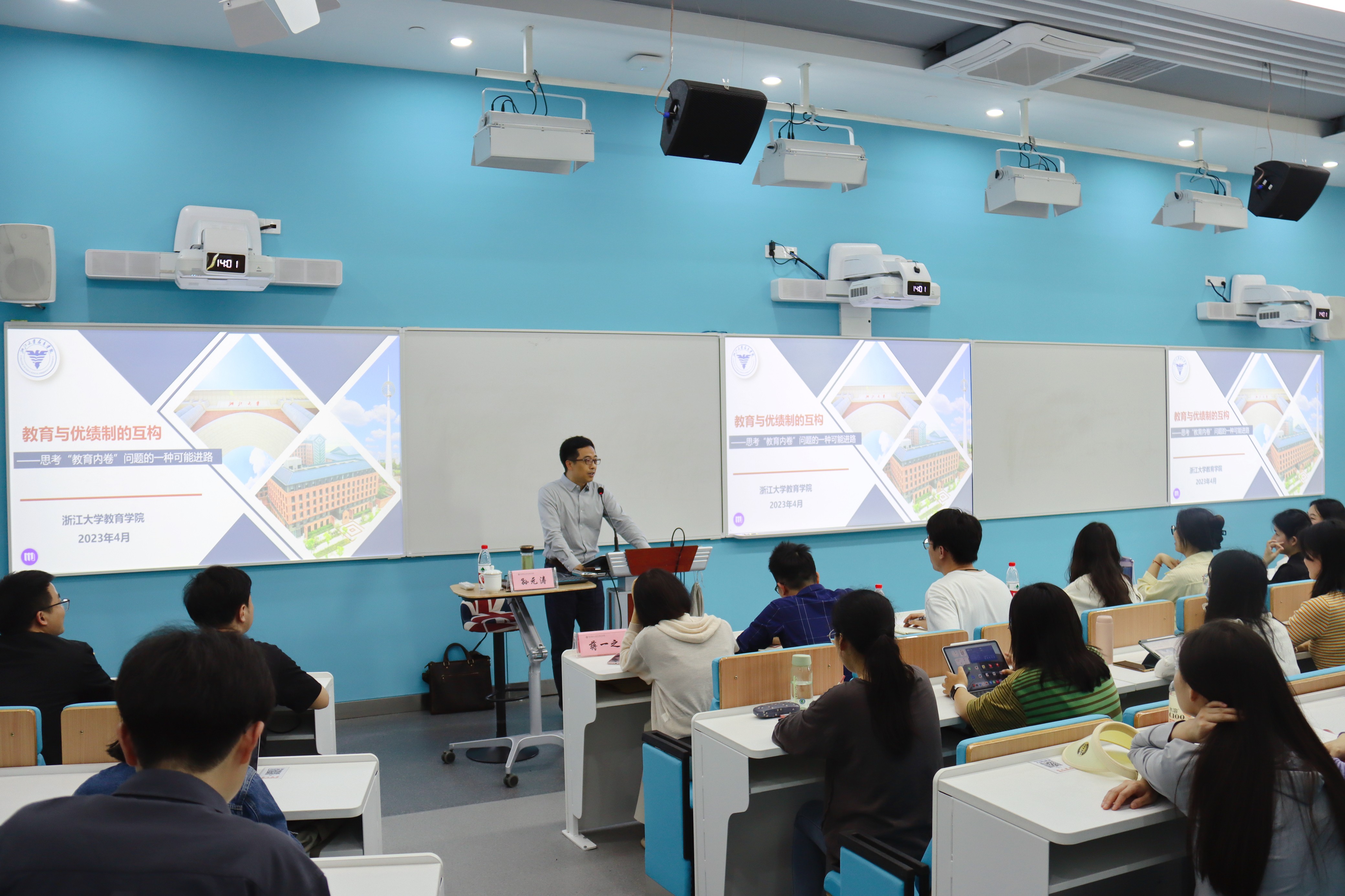 2023年4月9日下午,浙江大学教育学院副院长孙元涛教授做客第四十三期太炎教育讲堂,为天英足球即时比分 师生做题为“教育与优绩制的互构——关于教育内卷问题的另一种思考”的学术讲座。讲座由蒋一之教授主持,学院100余名师生参与了本次讲座。