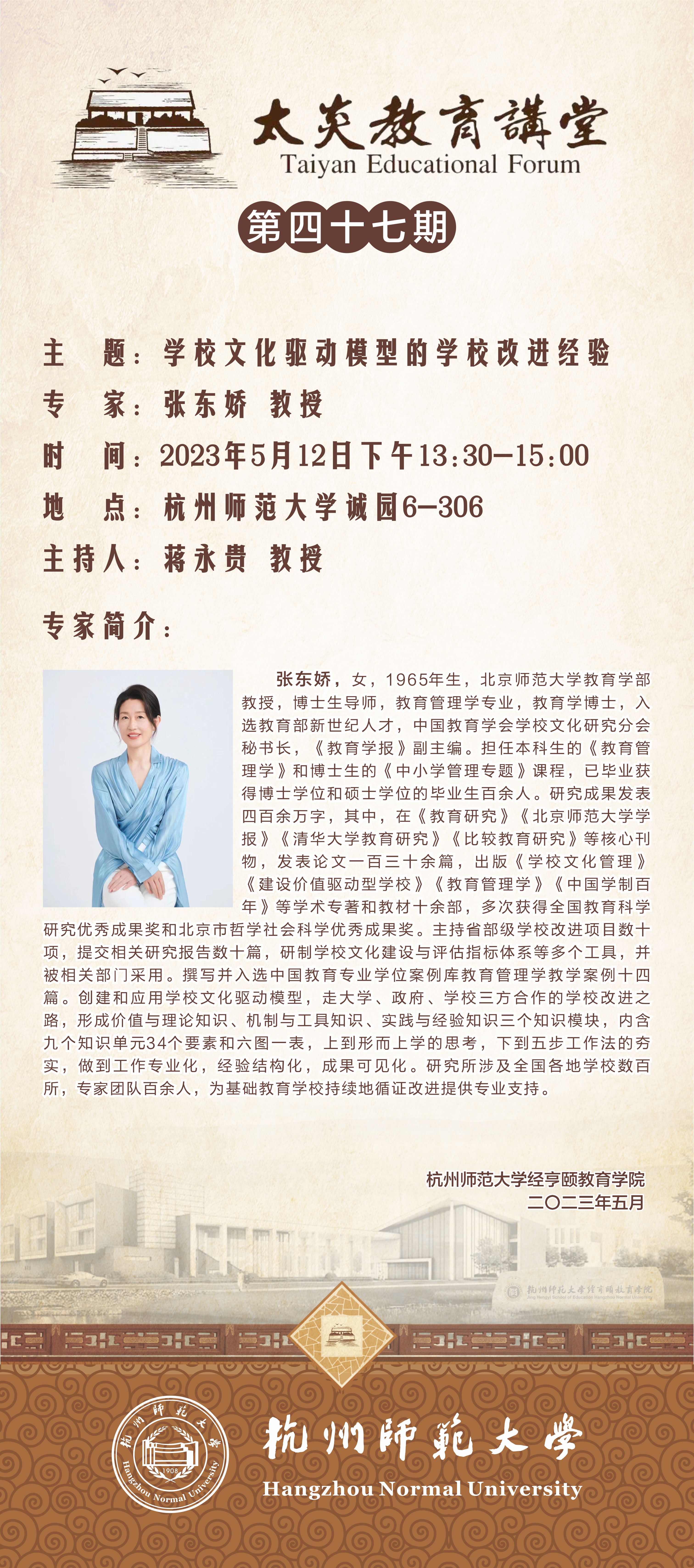 张东娇,女,1965年生,北京师范大学教育学部教授,博士生导师,教育管理学专业,教育学博士,入选教育部新世纪人才,中国教育学会学校文化研究分会秘书长,《教育学报》副主编。担任本科生的《教育管理学》和博士生的《中小学管理专题》课程,已毕业获得博士学位和硕士学位的毕业生百余人。研究成果发表四百余万字,其中,在《教育研究》《北京师范大学学报》《清华大学教育研究》《比较教育研究》等核心刊物,发表论文一百三十余篇,出版《学校文化管理》《建设价值驱动型学校》《教育管理学》《中国学制百年》等学术专著和教材十余部,多次获得全国教育科学研究优秀成果奖和北京市哲学社会科学优秀成果奖。主持省部级学校改进项目数十项,提交相关研究报告数十篇,研制学校文化建设与评估指标体系等多个工具,并被相关部门采用。撰写并入选中国教育专业学位案例库教育管理学教学案例十四篇。创建和应用学校文化驱动模型,走大学、政府、学校三方合作的学校改进之路,形成价值与理论知识、机制与工具知识、实践与经验知识三个知识模块,内含九个知识单元34个要素和六图一表,上到形而上学的思考,下到五步工作法的夯实,做到工作专业化,经验结构化,成果可见化。研究所涉及全国各地学校数百所,专家团队百余人,为基础教育学校持续地循证改进提供专业支持。