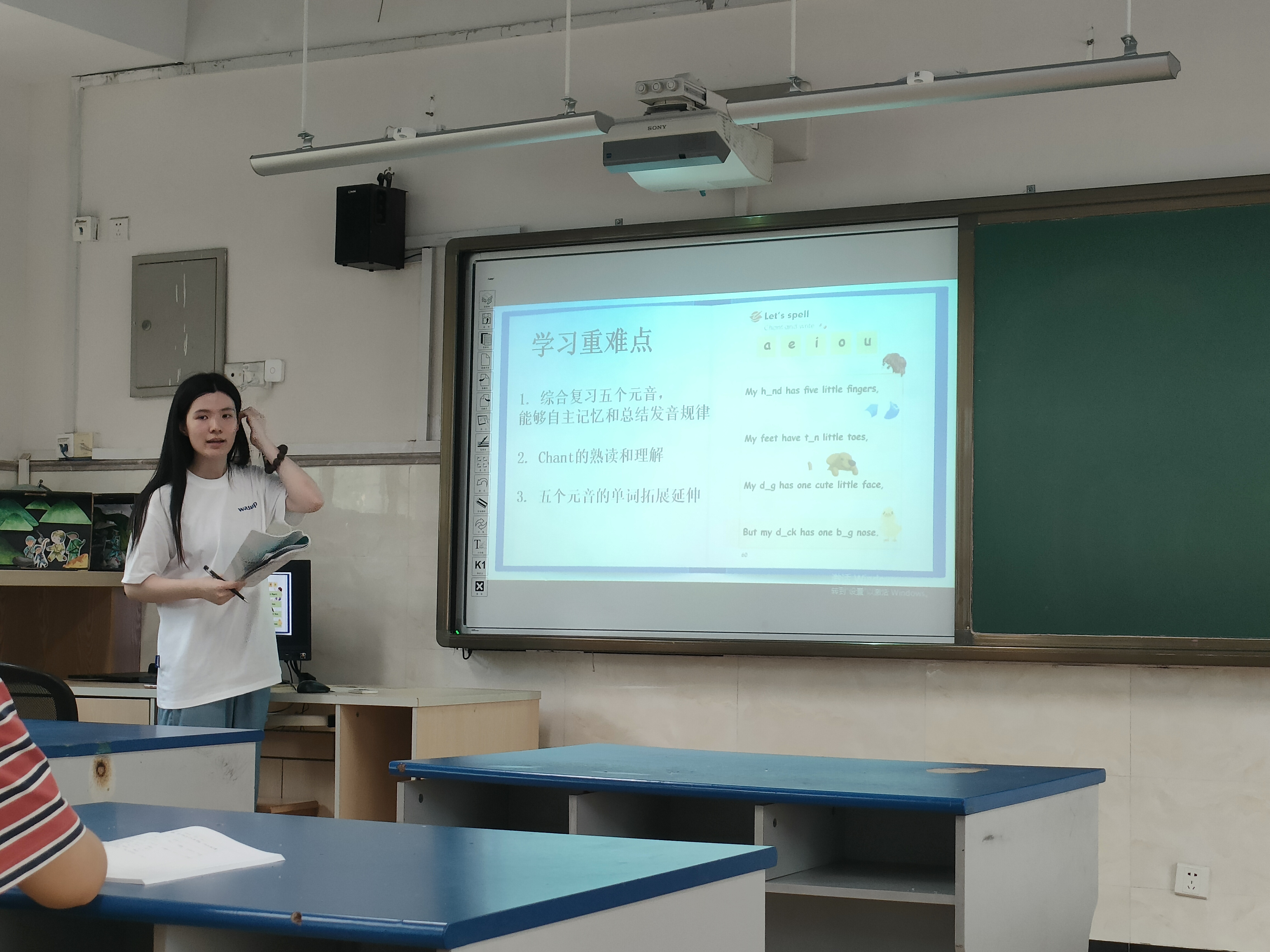 第二节语音课由李晴老师授课,内容为三年级下册Unit6 Let’s spell。在面对主体是三年级的活泼好动的小学生时,李老师设计了较为丰富的教学活动,精心准备了大量的生动的单词卡片,将较难的语音长句以chant的形式呈现,同时善用学生们的模仿天性,在表演和重复操练中练习元音字母的发音。在整个环节中,包含元音字母的单词也都是在整体的场景中呈现,做到情境带动发展。