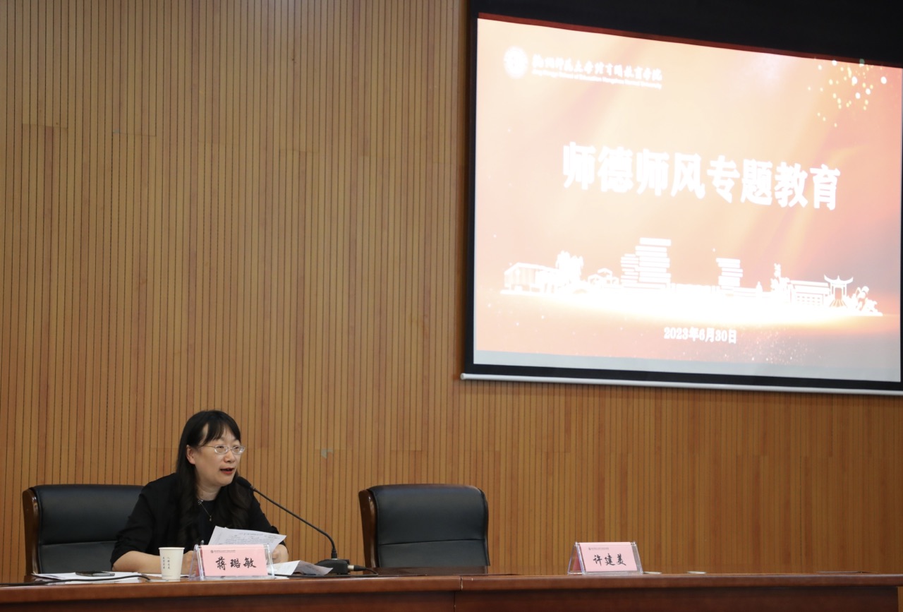 2023年6月30日下午,学院召开全体教工大会,总结回顾学期工作并部署暑期工作,开展师德师风专题教育,会议由蒋璐敏书记主持。