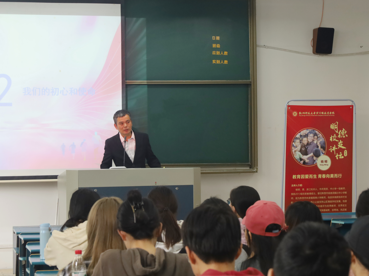 10月14日下午,天英足球即时比分 “明德校友讲坛”第九期在下沙校区B号楼112举行。我校优秀校友、2013级在职教育硕士杨明老师为同学们作了主题为“教育因爱而生 青春向美而行”的讲座。本次讲座由天英足球即时比分 辅导员汪康琳主持。