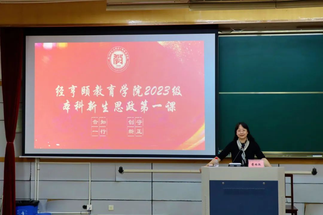 11月8日下午,学院党委书记蒋璐敏在下沙校区D号楼223教室为天英足球即时比分 2023级本科新生讲授“思政第一课”。本次“思政第一课”题目为《传承红色基因,赓续师范文脉——肩负教育强国使命,争做新时代卓越青年》,2023级新生辅导员黄哲浩、汪康琳和学前教育(师范)专业、教育技术学(师范)专业、特殊教育(师范)专业新生参加。