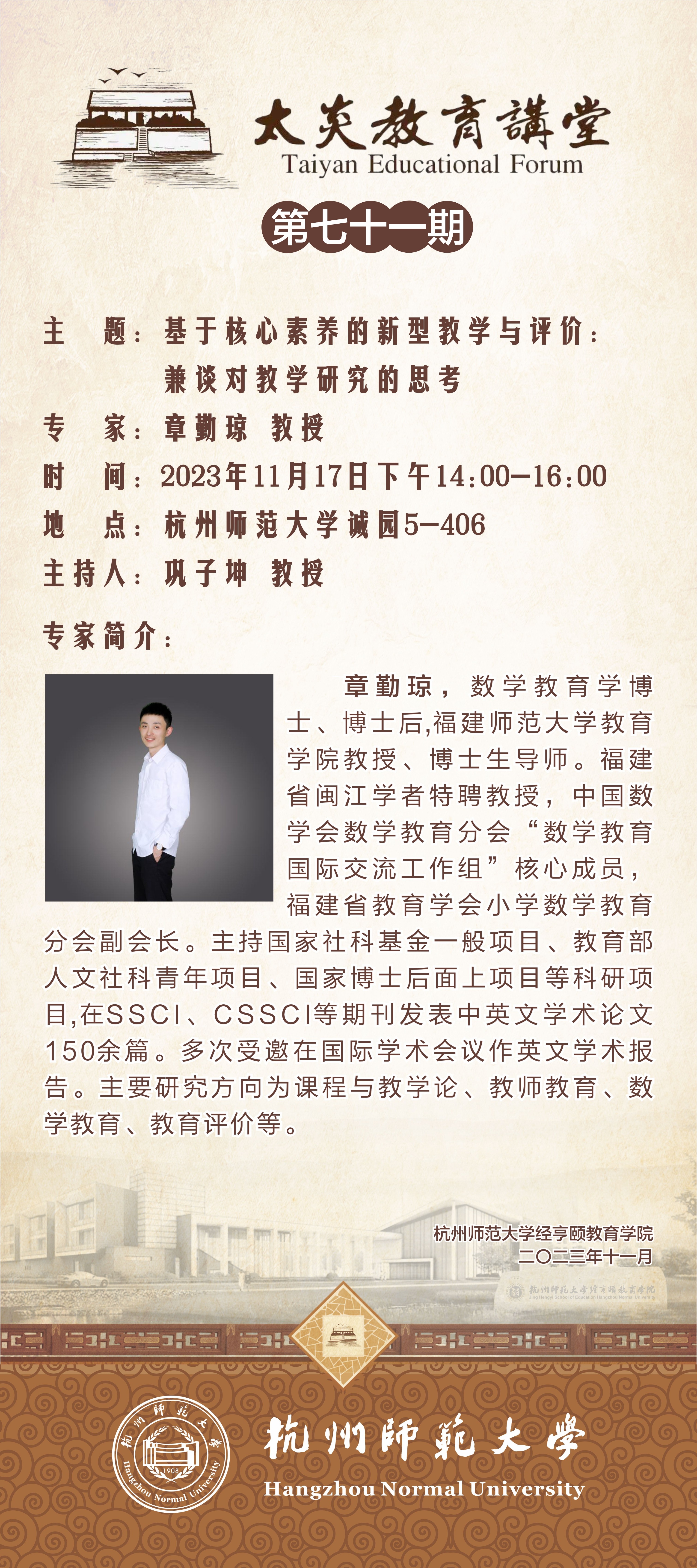 章勤琼,数学教育学博士、博士后,福建师范大学教育学院教授、博士生导师。福建省闽江学者特聘教授,中国数学会数学教育分会“数学教育国际交流工作组”核心成员,福建省教育学会小学数学教育分会副会长。主持国家社科基金一般项目、教育部人文社科青年项目、国家博士后面上项目等科研项目,在SSCI、CSSCI等期刊发表中英文学术论文150余篇。多次受邀在国际学术会议作英文学术报告。主要研究方向为课程与教学论、教师教育、数学教育、教育评价等。