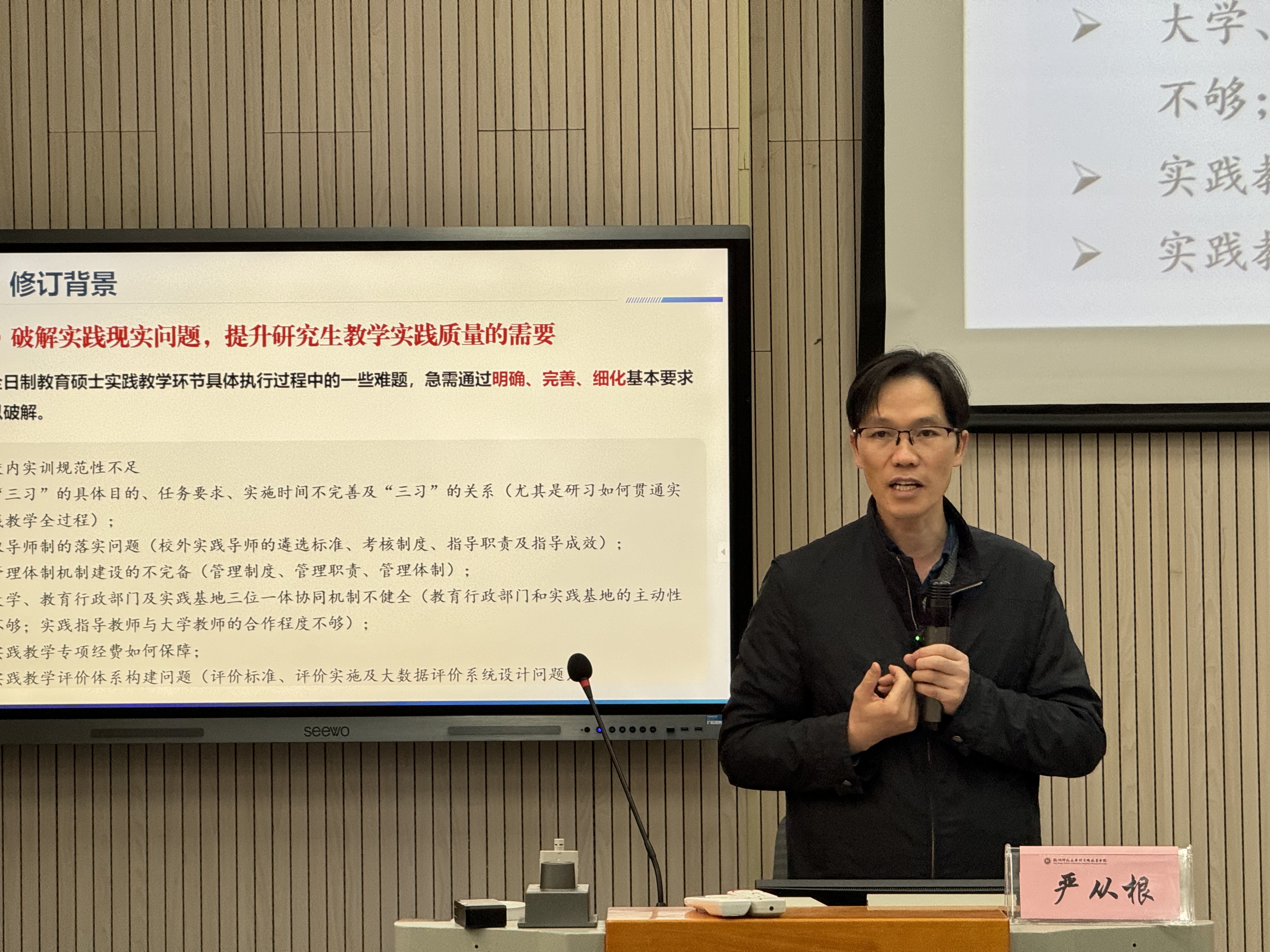 解读会由天英足球即时比分 执行院长、教育硕士负责人严从根教授主讲。首先严院长根据《全日制教育硕士专业学位研究生实践教学基本要求》,从修订背景、修订思路、内容要求及条件保障四个方面对研究生实践教学进行深入解析,并结合各师范院校开展实训、见习、实习优秀案例,指出了教育硕士实践教学修订的要点和方向。严院长强调,完善教育硕士实践教学模式,有助于构建高质量人才培养题体系、提升研究生教育教学实践能力、教育实践研究能力、培养卓越教师,并且突显研究生实践教学的教育性、研究性、教学性、系统性以及融合性。