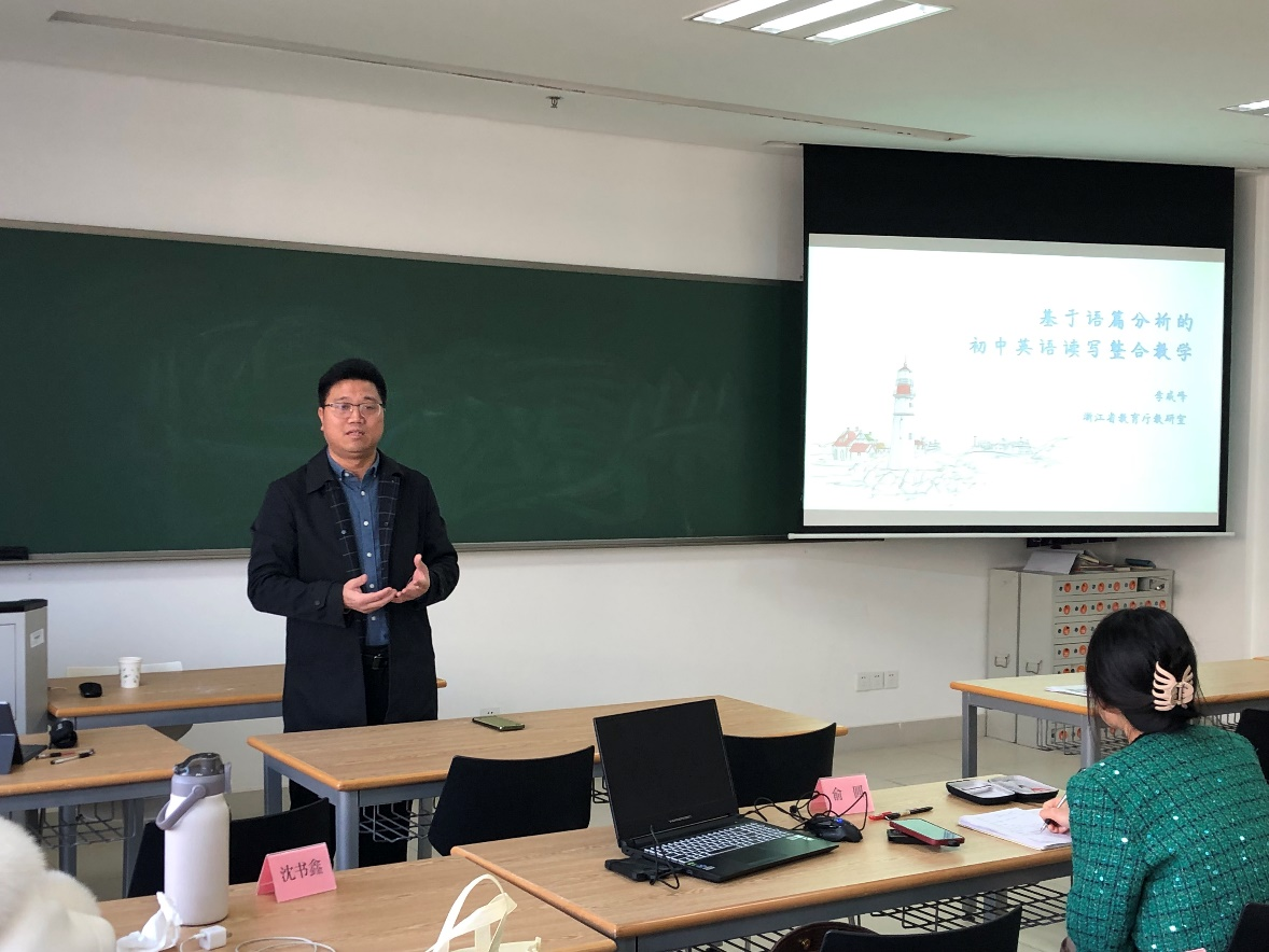 11月19日下午,浙江省教育厅教研室初中英语教研员李威峰老师带来了《基于语篇分析的初中英语读写整合教学》专题讲座。李老师从初中语篇视角高屋建瓴地阐述了语篇教学的内涵、语篇最主要的特征以及语篇的类型。李老师指出语篇为英语教学提供了基础资源,研读语篇是教师落实英语核心素养目标、创设合理学习活动的重要前提,研读语篇是教师开展有效教学设计的逻辑起点。教师要对语篇的主题、内容、文本结构、语言特点、作者观点等进行分析,并在此基础上,根据学生的已知和未知,确定单元教学目标、教学重点难点和为实现目标而促进学生主动探究意义。
