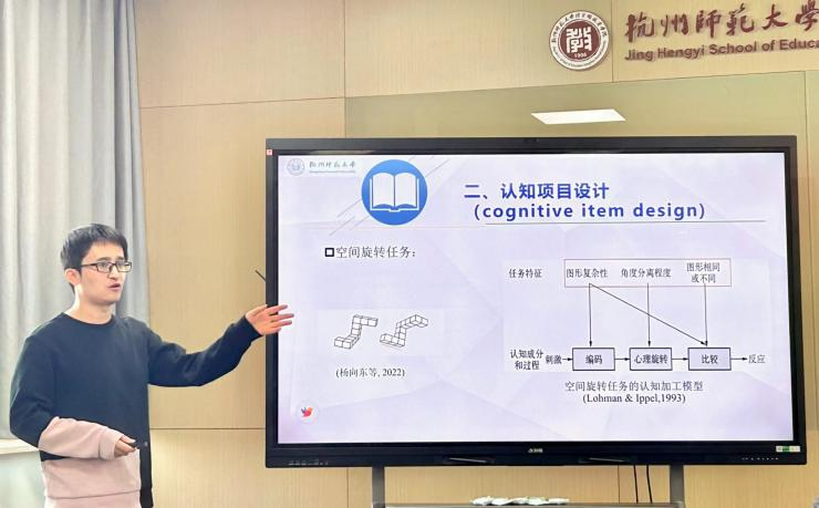 沙龙第一位主讲人是吴方文博士,吴老师主讲的题目是“基于认知项目设计的计算思想测评”。吴老师指出,传统的测验任务设计是经验性的,缺乏系统科学的设计原则。认知项目设计作为一种理论驱动的测量模式,能将测验开发过程转变成对理论模型与测验任务的假设进行检验的过程。为此,他的研究以Embretson提出的认知项目设计理念为指导,从认知心理学的视角出发提出并检验了一个符合计算问题解决的计算思维认知模型。围绕该认知模型,以经典的Scratch编程活动为任务,该研究鉴别并界定了影响模型中不同认知成分及过程的任务特征。基于实测数据的测量学分析表明,认知模型对测验任务的难度变化具有较高的解释度,且三个任务特征均显著预测了任务的难度。最后,通过对个体解决编程任务的过程性数据进行统计建模,研究发现贝叶斯网络模型可以从理论上较好地解释基于过程性数据的计算思维测评结果,且相应的测验具有较理想的信效度。孙丹老师认为吴老师采用了贝叶斯网络模型等非常前沿的方法开展研究,整体上为相关研究提供了范例,同时也启发了教育评价的新思路,并就如何将研究中的行为数据转换为编码、图形化工具与吴老师进行了互动和交流。韩柽炀老师就该研究采取的计算思维测评方式是否适用教育和心理测量与吴老师进行了互动与交流。