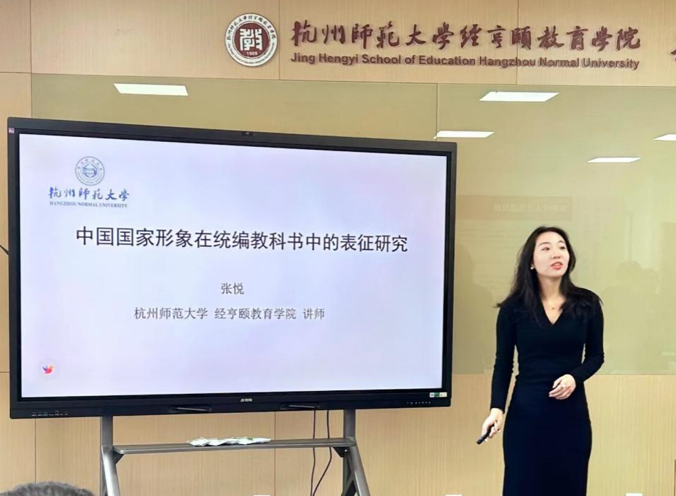沙龙第二位主讲人是张悦博士。张老师主讲的题目是“中国国家形象在统编教科书中的表征研究”。张老师指出,全球化背景下如何提升统编教科书建构国家形象的自觉意识格外重要。该研究重点呈现了义务教育阶段《道德与法治》、《历史》和《语文》三科统编教科书对中国国家形象的不同社会表征,这些表征围绕着不同的中心核心与外围要素,构建了同一中国形象的多重方面。《道德与法治》教科书建构了文明强盛不断发展的中国,《历史》教科书塑造了在辉煌与苦难中崛起的中国,《语文》教科书描绘了美丽坚毅国民相依的中国,且三科中国国家形象的社会表征结构存在共同的中心要素,包括政治民主、经济繁荣、合作共赢、共产主义、注重国内国外互动等。该研究还思考了在更大的背景下,中国国家形象社会表征对于公民培养与国家认同的意义。严从根老师就该研究基于PRISMA声明的文献检索与张悦老师进行了互动交流。郭洪瑞老师认为张悦老师的选题具有创新性,运用解释主义、扎根理论自下而上地展开研究,并就如何对文本进行具体编码提出了疑问。孙丹老师认为张悦老师的研究有利于中小学生树立正确的爱国信念和弘扬社会主义核心价值观。程建坤老师提出对教材中的国家形象内容维度进行归类时是否会出现一个文本包含两种内容维度的情况以及如何对其进行分类。两位学生提出如何运用元分析开展文献梳理时如何扩充文献和寻找遗漏文献、如何制定国家形象分析框架两个问题。张老师对几位老师和同学提出的问题进行了系统回应。