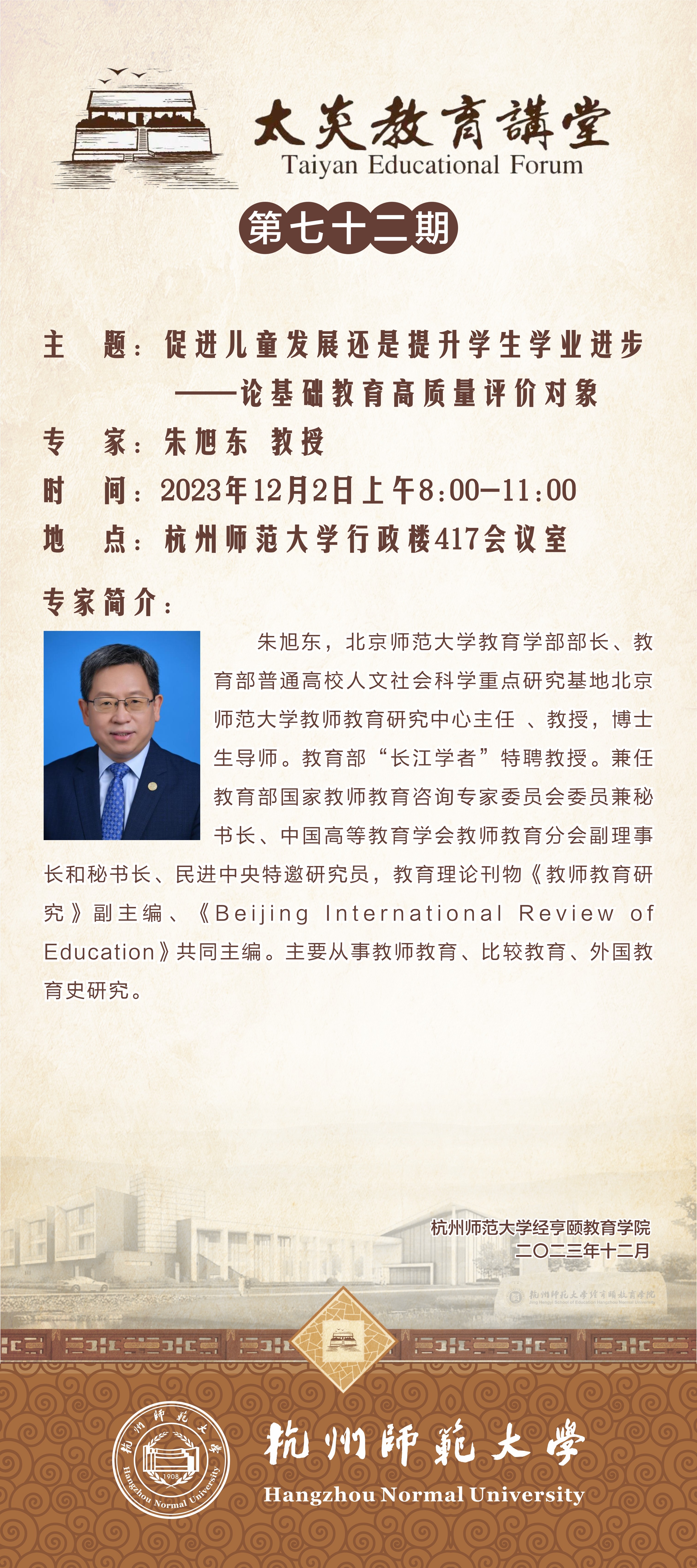 朱旭东,北京师范大学教育学部部长、教育部普通高校人文社会科学重点研究基地北京师范大学教师教育研究中心主任 、教授,博士生导师。教育部“长江学者”特聘教授。兼任教育部国家教师教育咨询专家委员会委员兼秘书长、中国高等教育学会教师教育分会副理事长和秘书长、民进中央特邀研究员,教育理论刊物《教师教育研究》副主编、《Beijing International Review of Education》共同主编。主要从事教师教育、比较教育、外国教育史研究。