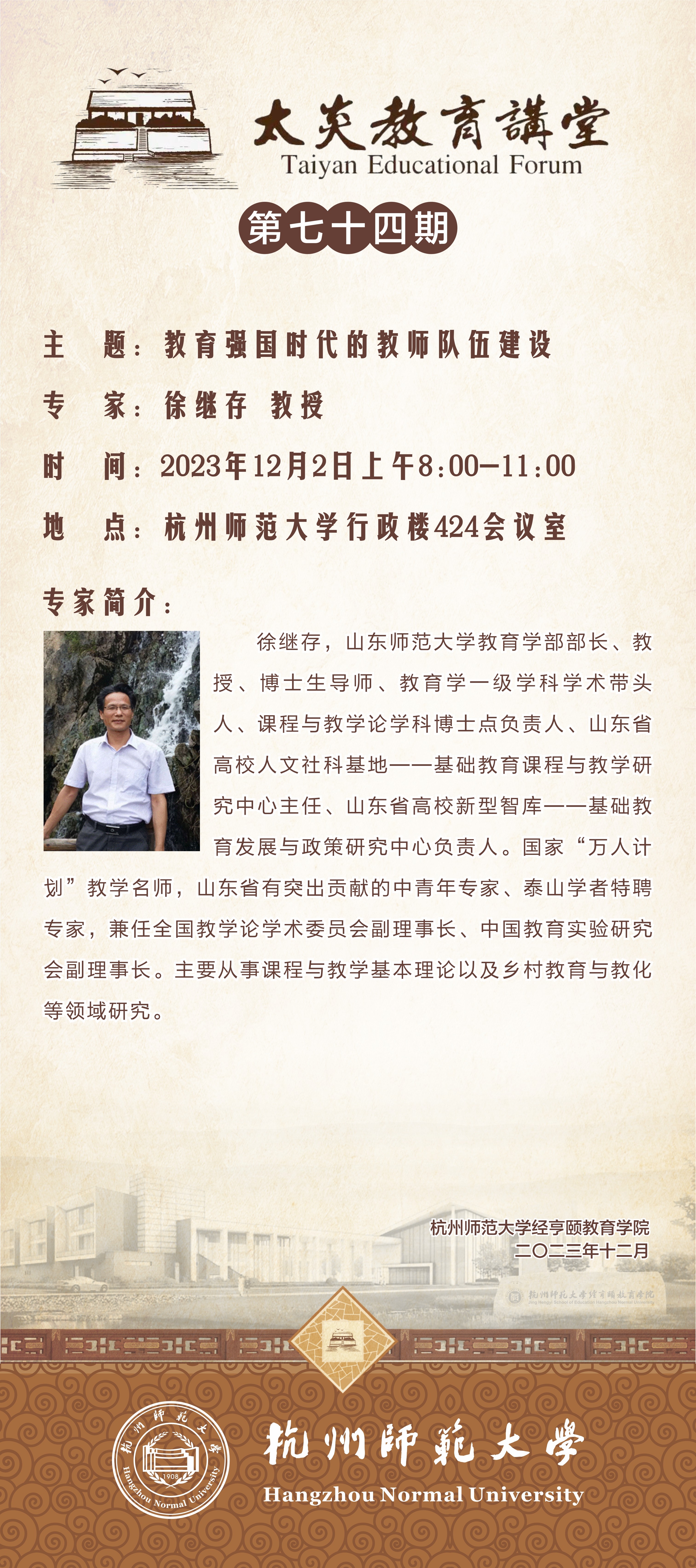 徐继存,山东师范大学教育学部部长、教授、博士生导师、教育学一级学科学术带头人、课程与教学论学科博士点负责人、山东省高校人文社科基地——基础教育课程与教学研究中心主任、山东省高校新型智库——基础教育发展与政策研究中心负责人。国家“万人计划”教学名师,山东省有突出贡献的中青年专家、泰山学者特聘专家,兼任全国教学论学术委员会副理事长、中国教育实验研究会副理事长。主要从事课程与教学基本理论以及乡村教育与教化等领域研究。