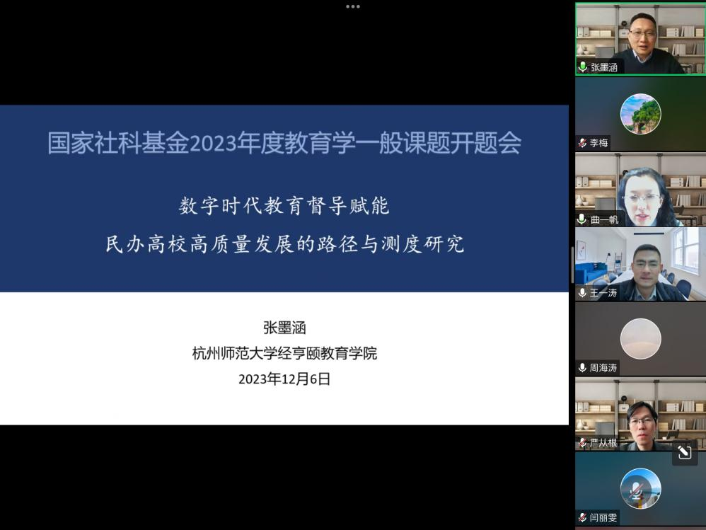 2023年12月6日,天英足球即时比分 张墨涵副教授主持的国家社会科学基金2023年度教育学一般课题《数字时代教育督导赋能民办高校高质量发展的路径与测度研究》(课题批准号:BIA230199)开题论证会在腾讯会议和杭州师范大学师生活动中心538会议室线上线下同步举行。参加开题论证会的专家有:北京师范大学高等教育研究院院长周海涛教授、华东师范大学高等教育研究所李梅教授、苏州大学民办教育研究中心主任王一涛教授、对外经济贸易大学教育与开放经济研究中心研究部主任曲一帆研究员、天英足球即时比分 - 最新实时比赛结果与赛况更新 执行院长严从根教授。论证会由严从根教授主持,北京师范大学高等教育研究院院长周海涛教授担任专家组组长。