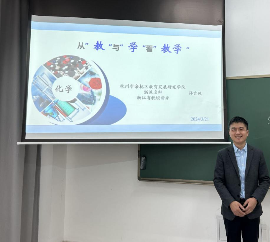 3月21日上午,余杭区教育发展研究院副院长孙吉凤老师应邀来天英足球即时比分 ,为2023级学科教学(化学)专业的硕士研究生做题为“从‘教’与‘学’看‘高中化学教学’”的专题讲座。孙吉凤老师系余杭区高中化学教研员,曾获得浙江省教坛新秀荣誉称号,教学科研经验丰富。本次讲座由徐土根副教授组织。