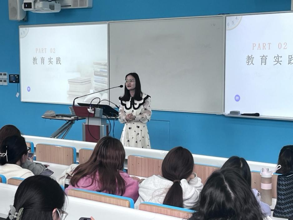 最后,由杨丹飞从“学术研究心得和教育教学实践”展开分享,同样作为已经毕业工作的学姐,她高度关注思维性、情感性的课堂,以课堂学习为跳板,以课外研学为动力圈,不断突破、挑战自我。她发表的《潮起云涌之衙前农民运动》荣获杭州师范大学第四届“云师友”线上线下混合式教学设计与实践一等奖。在科研上,总共发表3篇论文,《微课在初中语文教学中的应用研究》论文荣获微课论文国家级一等奖。实习经验丰富,能组织多种教学方式,灵活教学。