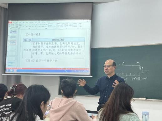 梁校长首先对小学数学中“数量关系”主题的整体框架做了全面梳理,总结各学段内容分布与调整情况。接着梁校长为同学们播放了一节“数量关系”教学实录,借助“杭州黄龙体育馆”中座位数这一教学内容与同学们展开深入讨论,并强调选用真实素材教学的必要性与重要性。最后,梁校长带领同学们针对相向运动这一情境,开展数量关系教学设计,拓展出三种不同模型,并对同学们的教学思路进行细致的点评。